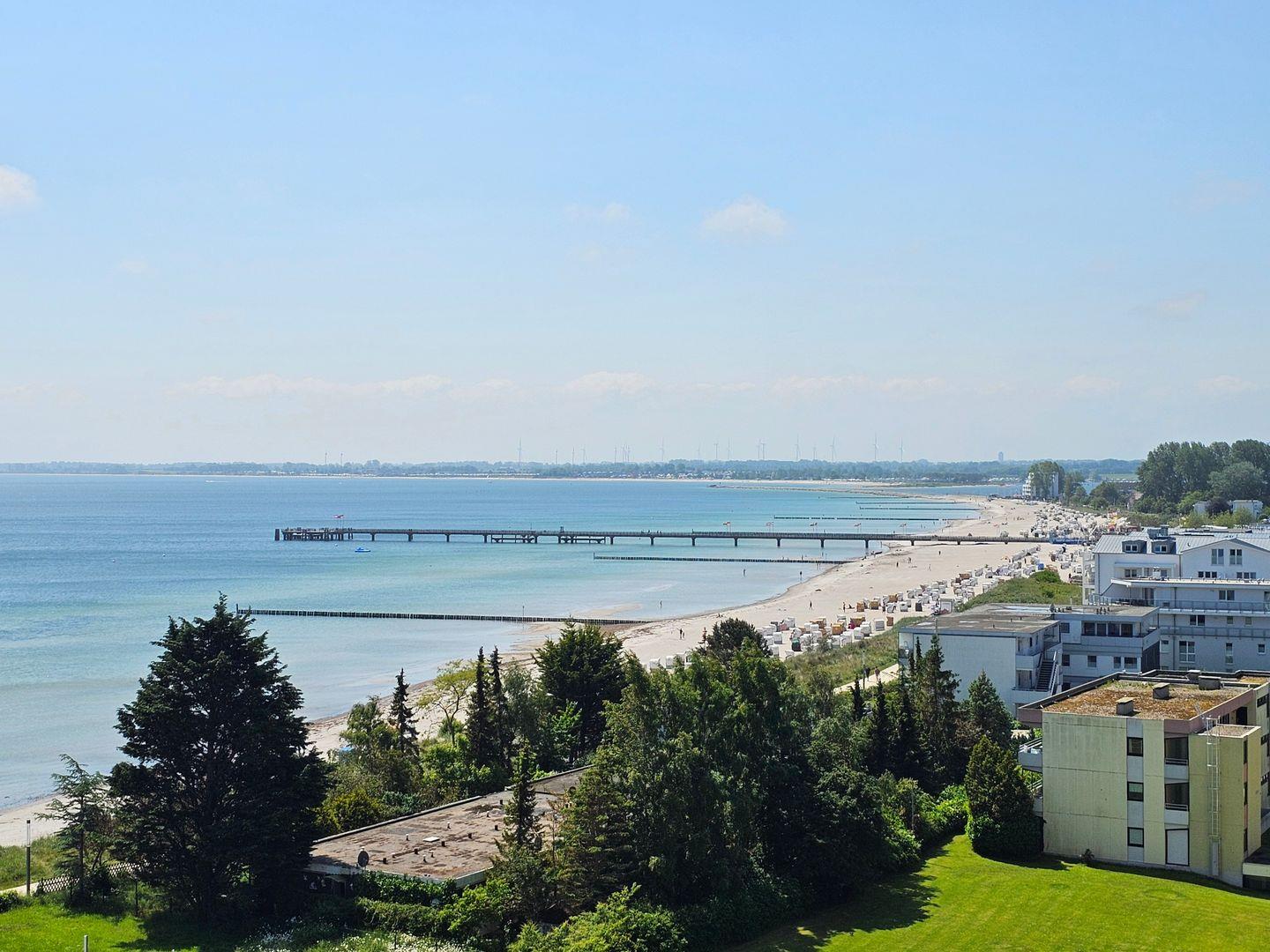 Vom süd-west ausgerichteten möblierten Balkon mit herrlichem Ausblick über den gesamten Südstrand, die Promenade und das Meer genießen Sie die Sonne von mittags bis abends. Eine Markise bietet Ihnen hier einen hervorragenden Sonnenschutz.