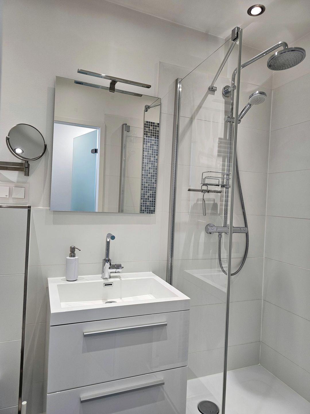 Das neue, hell geflieste Bad verfügt über eine besonders geräumige Dusche mit Glaswänden und flachem Einstieg. Handtuchheizkörper, Steckdosen, ein Waschbeckenunterschrank mit Schubladen sowie ein beleuchteter Spiegel sind weitere Annehmlichkeiten die Ihnen dieses Duschbad im Urlaub bietet.