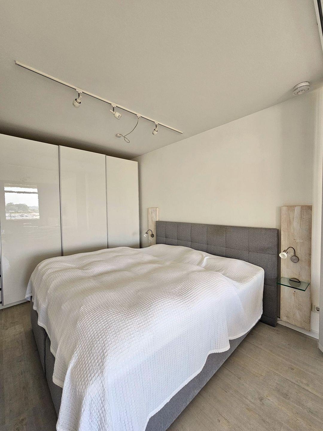Im Schlafbereich steht ein hochwertiges Doppelbett für entspannte Urlaubsnächte bereit. Dahinter findet sich jede Menge Platz für Ihre Urlaubsgarderobe in dem großen 3-türigen Kleiderschrank.