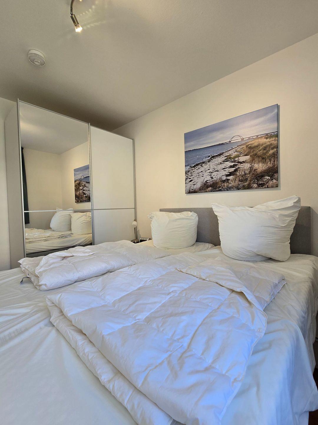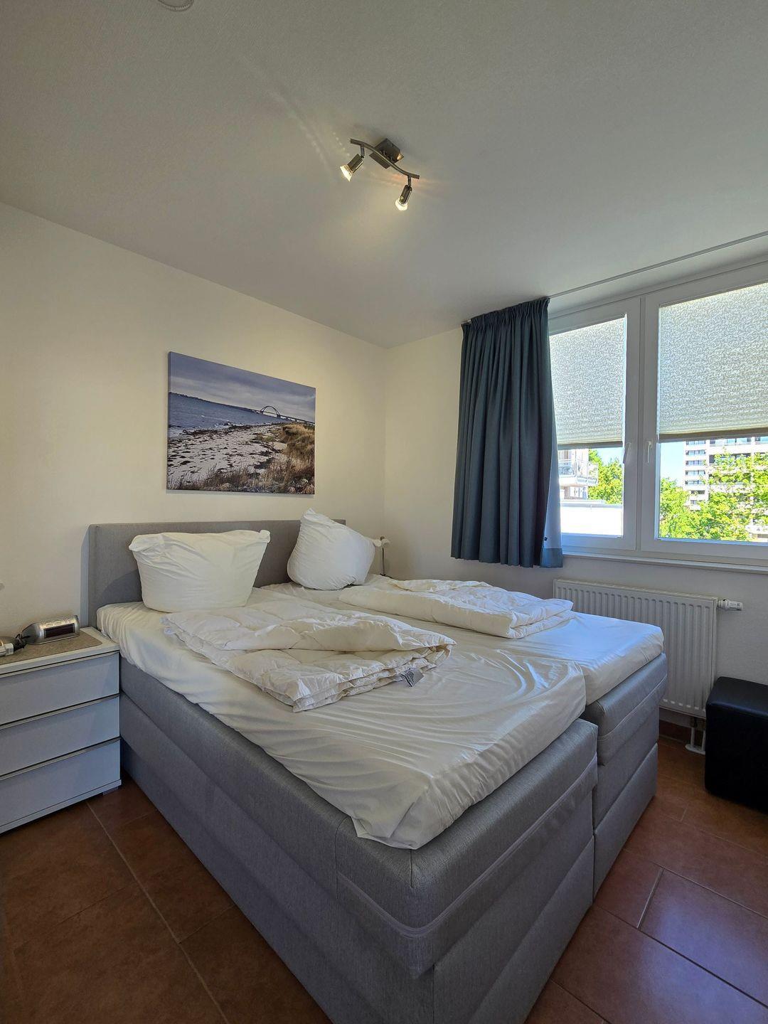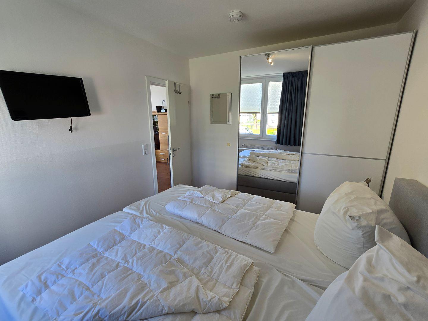 Die Ferienwohnung verfügt über ein Schlafzimmer mit einem Doppelbett und einem Flachbildfernseher. Für einen erholsamen Schlaf sind die Betten mit hochwertigen Matratzen ausgestattet. Die Fenster im Schlafzimmer sind zusätzlich zu den Vorhängen mit Verdunklungs-Plissees ausgestattet.