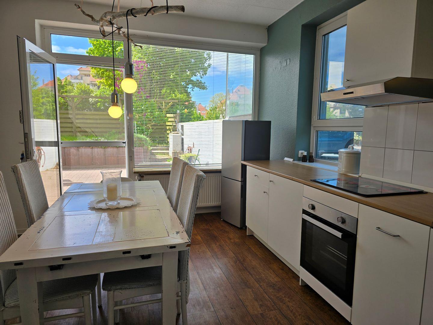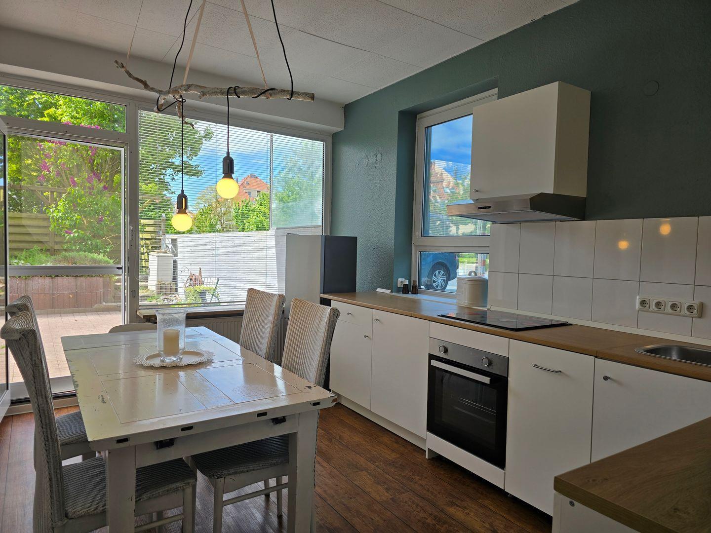 Die anschließende, neue Einbauküche ist umfassend eingerichtet und verfügt über einen Geschirrspüler, Induktionsfeld, Backofen, Kühlschrank und separaten Gefrierschrank sowie Ausstattung zum Kochen und Servieren. Am großen Esstisch finden alle Gäste für gemeinsame Mahlzeiten oder entspannte Spieleabende Platz.