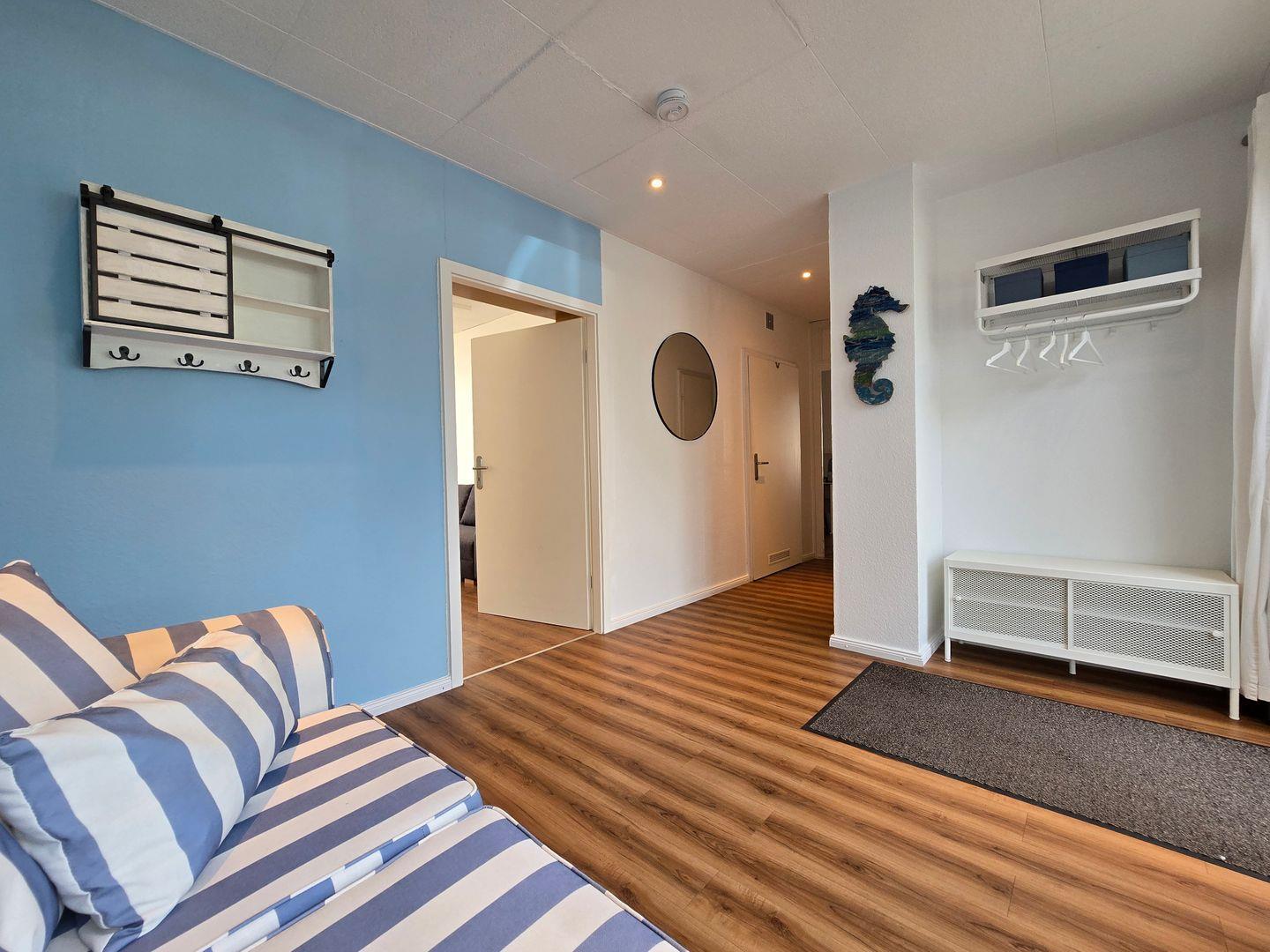 Im zweiten separaten Schlafzimmer steht ein Doppelbett (160*200 cm) für entspannte Urlaubsnächte bereit. Ein großer Kleiderschrank zum Verstauen der Urlaubsgarderobe, Couchgarnitur, Beistelltisch und Korbsessel komplettieren die Einrichtung. Die Schlafcouch bietet für bis zu zwei Gästen (140*200cm) ein weiteres gemütliches Nachtlager.