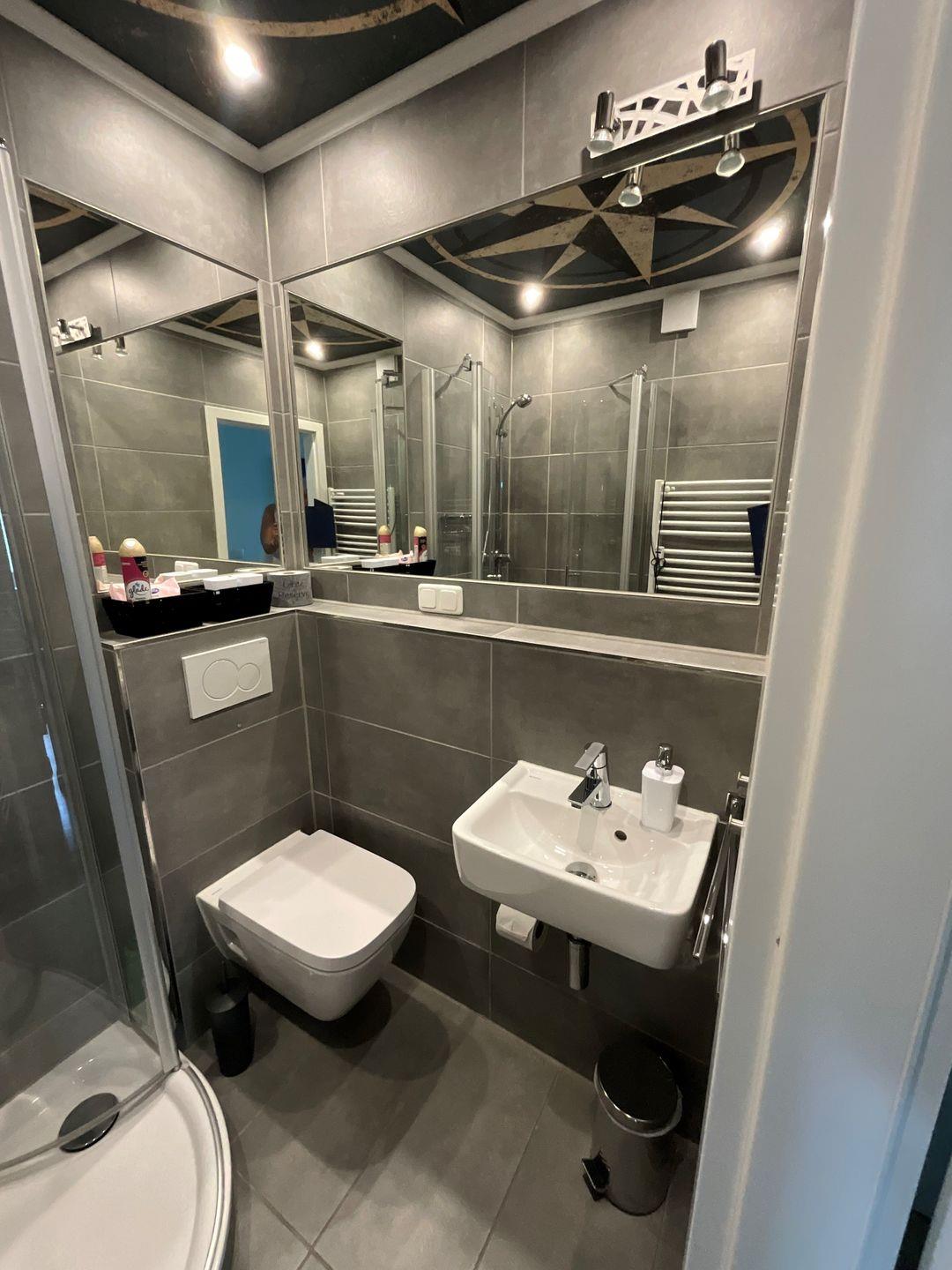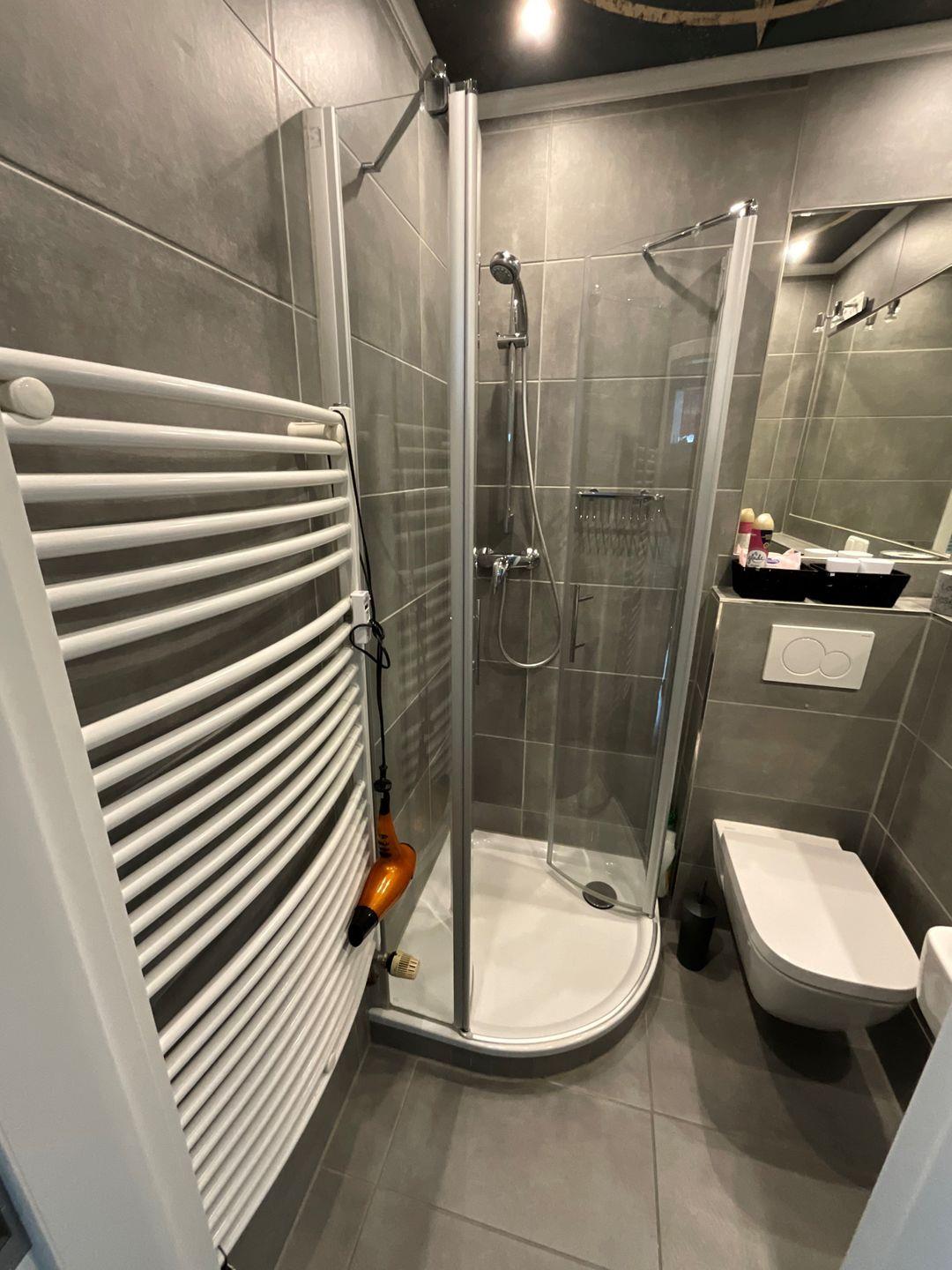 Gegenüber des Schlafzimmers erreichen Sie das hochwertige Badezimmer mit großem, beleuchtetem Spiegel, Handtuchheizkörper, Steckdosen und wandmontiertem WC. Eine geräumige Dusche mit hochwertigen Glastüren und Armaturen rundet hier die Ausstattung ab.
