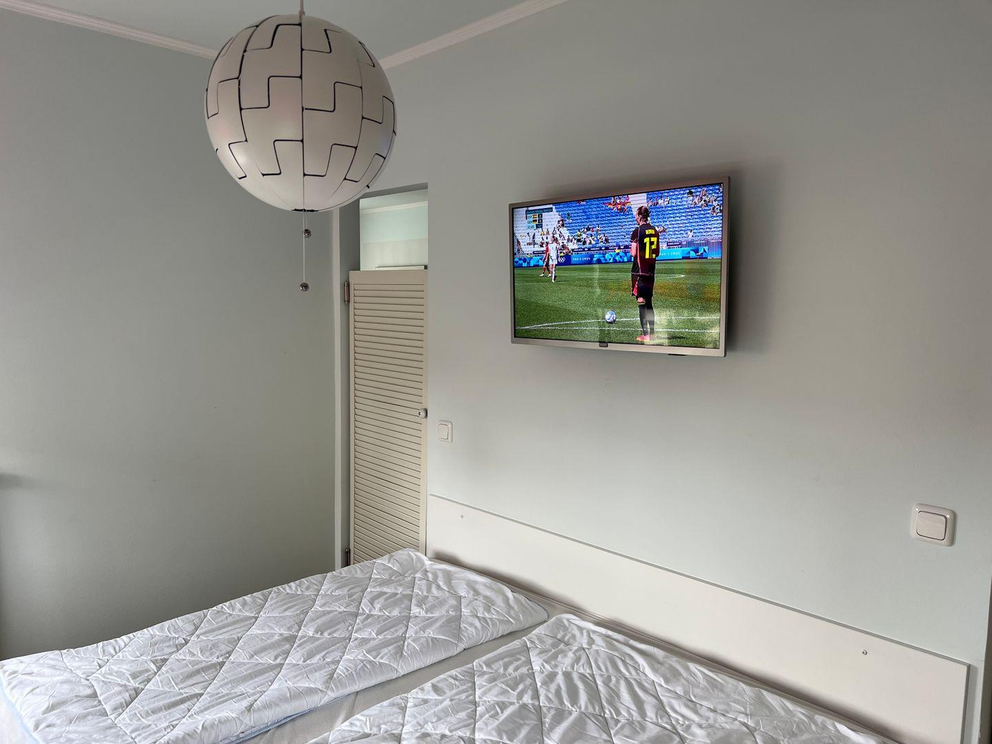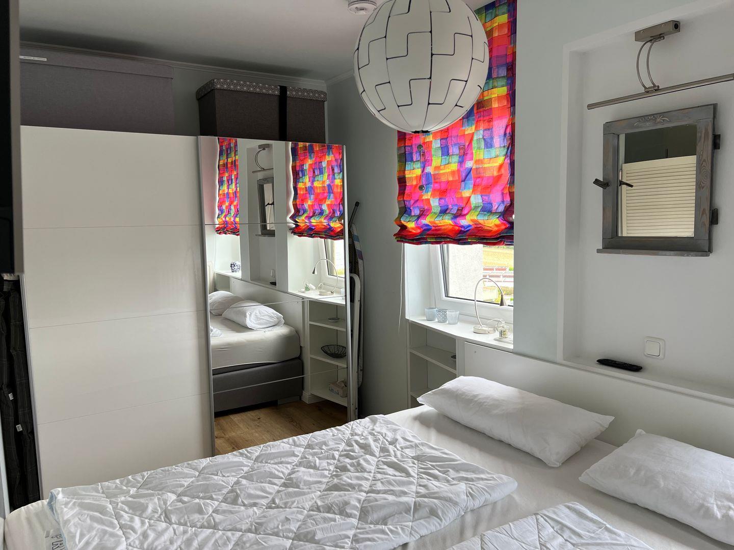 Das Schlafzimmer betreten Sie durch eine der beiden Schwingtüren links oder rechts vom einladenden Doppelbett (180*200 cm). Zwei Fenster sorgen für ausreichend Helligkeit und Frischluft in diesem Raum. Im Schlafzimmer stehen Ihnen ein großer Kleiderschrank mit Spiegel, Ablage- und Verdunklungmöglichkeiten, ein zweiter TV und Leselampen zur Verfügung.