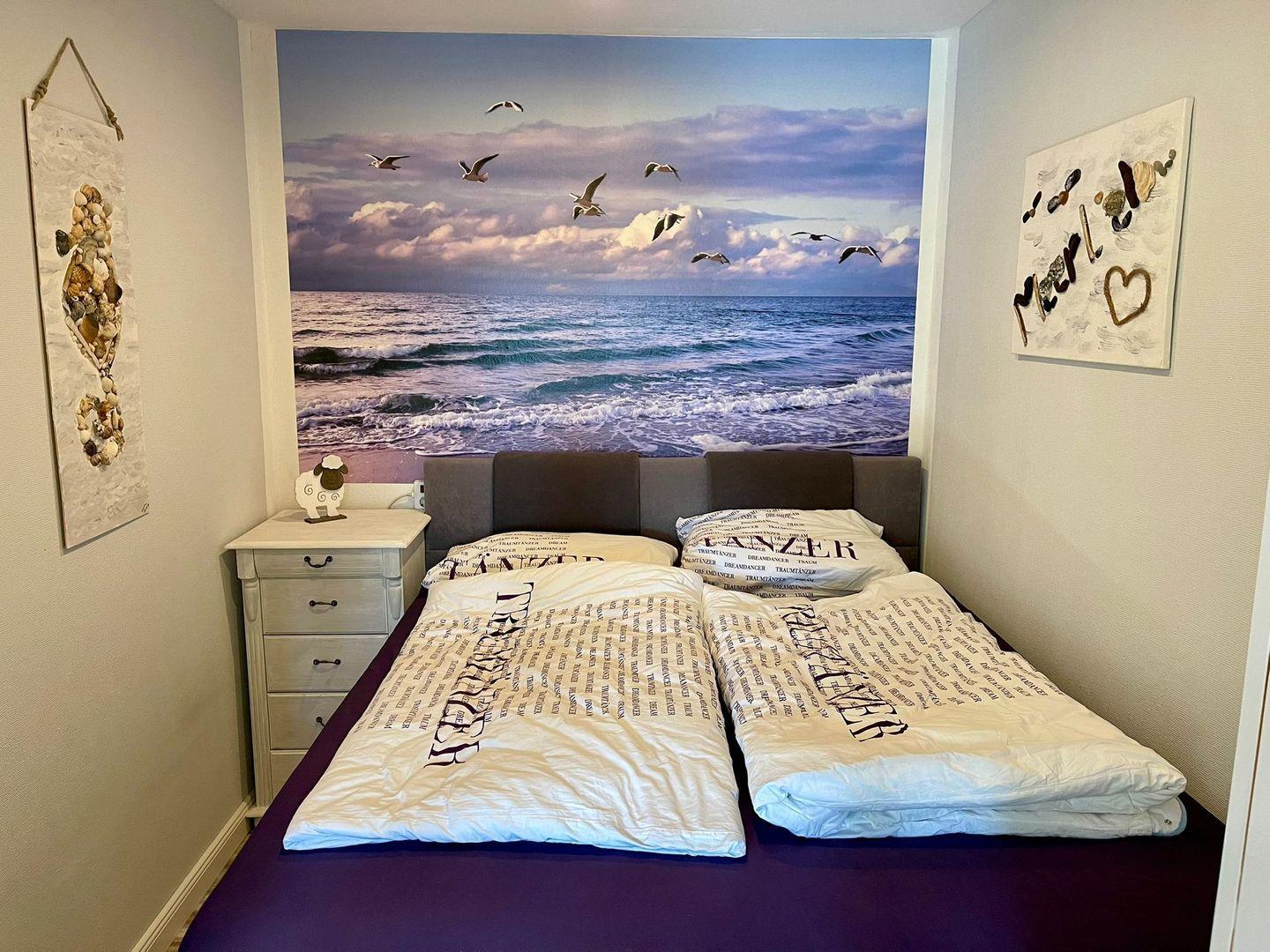 Im Schlafbereich steht ein hochwertiges Boxspringbett von 160 x 200 für entspannte Urlaubsnächte bereit. Der Raum verfügt über einen geräumigen Einbauschrank und Sie können hier so problemlos ihre Urlaubsgarderobe verstauen. Die Abtrennung zum Wohnbereich kann optisch mit einem Vorhang vorgenommen werden.