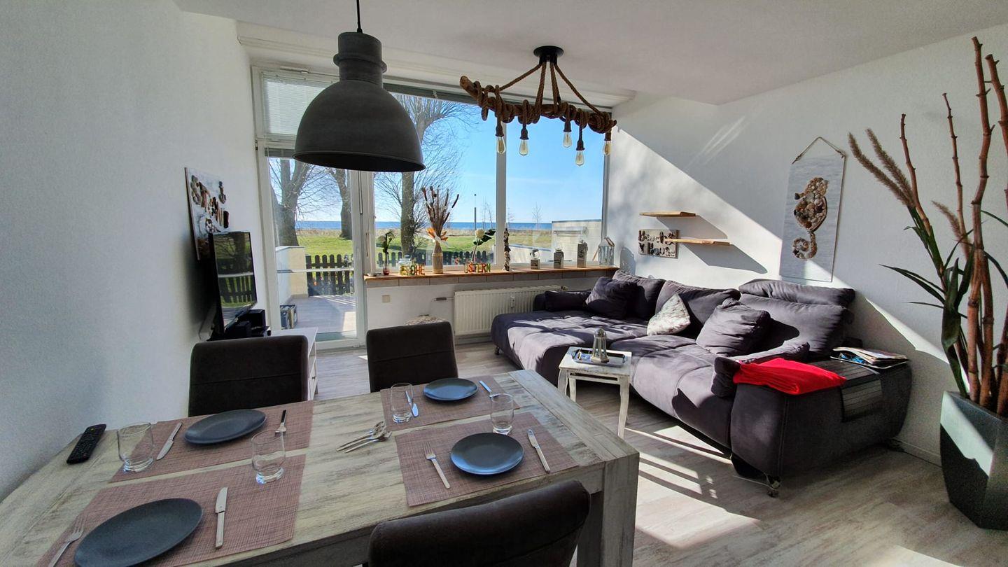 Das Wohnzimmer ist einladend und komfortabel eingerichtet, ideal für entspannte Abende. Die Sofaecke bietet genügend Platz zum Entspannen und einem spannenden Filmabend – dafür stehen Ihnen gleich zwei TVs inklusive App gesteuertem SmartTV zur Verfügung. Verbringen Sie gemütliche Stunden mit Ihren Liebsten, während Sie die Aussicht auf das Meer genießen. Das Highlight dieser Ferienwohnung ist die großzügige Terrasse, die Ihnen nicht nur außergewöhnlich gute Ausblicke auf die Ostsee gewährleistet, sondern auch mit Gartenmöbeln und Markise ausgestattet ist, um das Klima in vollen Zügen zu genießen.