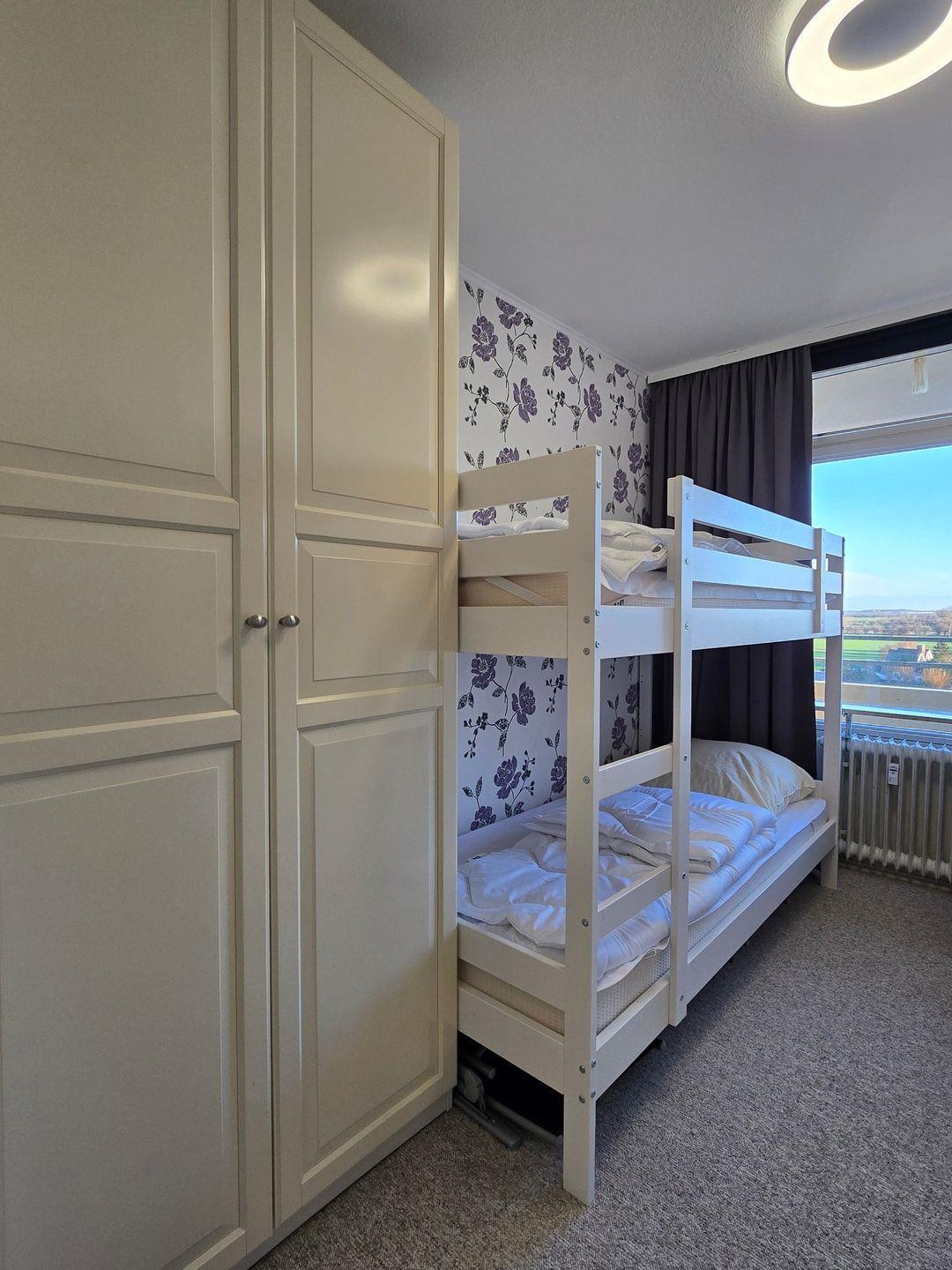 Im Schlafbereich befindet sich ein großes Doppelbett sowie ein geräumiger Kleiderschrank, um Platz für ihre persönlichen Dinge zu schaffen. Im separaten weiteren Raum stehen ihnen ebenfalls Möglichkeiten zum Verstauen sowie ein Etagenbett zur Verfügung.