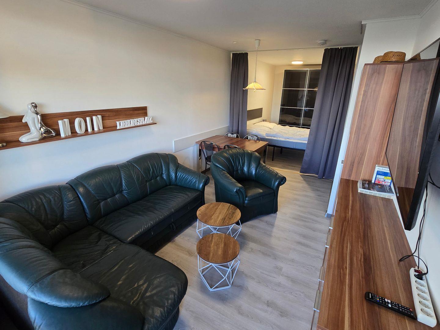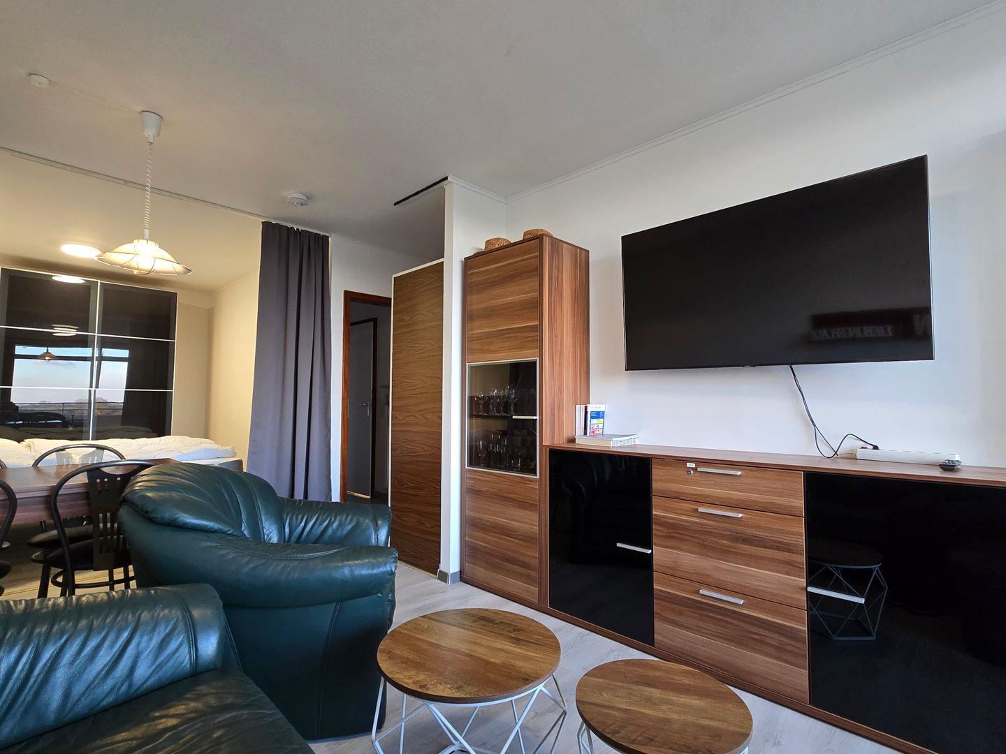 Mit einer großzügigen Wohnfläche von 46 m² bietet die Wohnung Platz für bis zu vier Personen und überzeugt durch eine durchdachte Raumaufteilung. Ein helles Wohnzimmer, das offen zur Küche gestaltet ist, lädt zum Verweilen ein. Hier erwarten Sie eine voll ausgestattete Küche mit allen notwendigen Utensilien, einschließlich Herd, Kühlschrank, Geschirrspüler, Heissluftfriteuse, Mikrowelle mit Grillfunktion und einer Kaffeemaschine (Caffisimo). Ob ein entspannter Frühstücksbrunch oder das gemeinsame Abendessen – die Ferienwohnung bietet den idealen Platz dafür. Sie können auch den überdachten Balkon nutzen, welcher mit Sitzgelegenheiten ausgestattet ist – der perfekte Ort für eine Tasse Kaffee an der frischen Luft oder ein Glas Wein am Abend. Das herrliche Meeresrauschen wird ihr Urlaubsfeeling komplett abrunden.