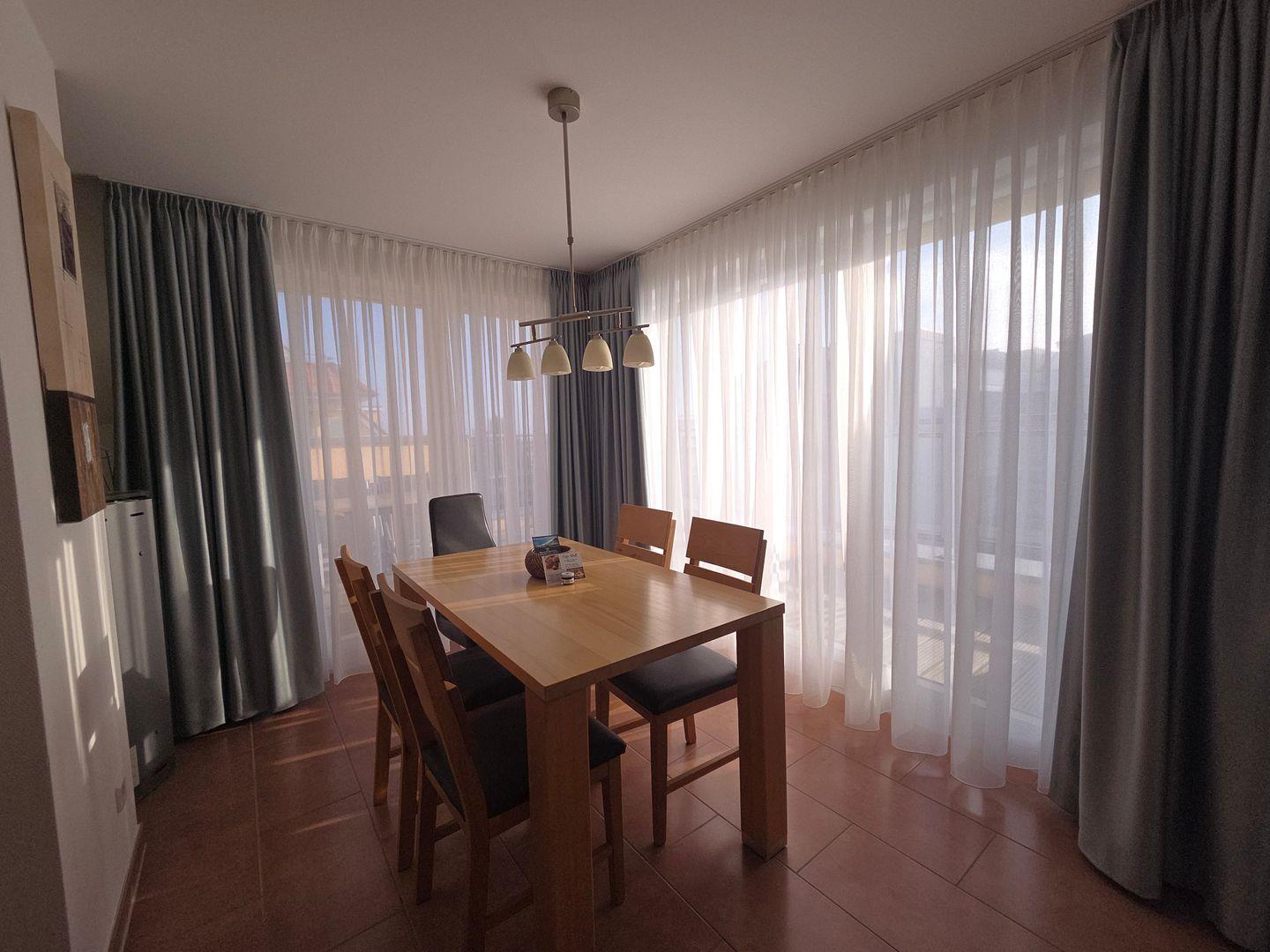 Im Übergangsbereich zur gemütlichen Essecke steht ein moderner Esstisch. Dieser kann mit bis zu 6 Personen angenehm genutzt werden.