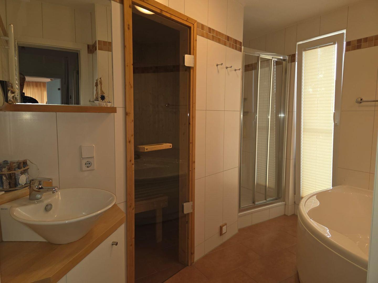 Ein Bad mit Dusche, Eckbadewanne, Sauna, etc.