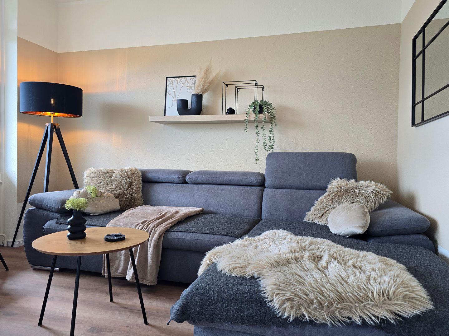 Das großzügige Wohnzimmer ist mit einem Vinyl-Bodenbelag versehen und bildet gemeinsam mit der offen gestalteten Küche den Mittelpunkt der Ferienwohnung. Im Wohnbereich erwarten Sie eine gemütliche Sofaecke, ein Sessel und einem Essbereich mit Esstisch. Für Ihre Unterhaltung stehen zwei Fernseher sowie ein Radio zur Verfügung.