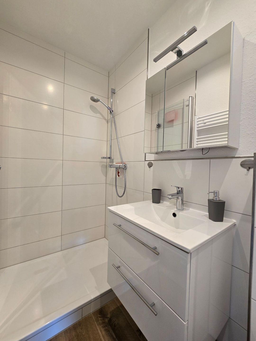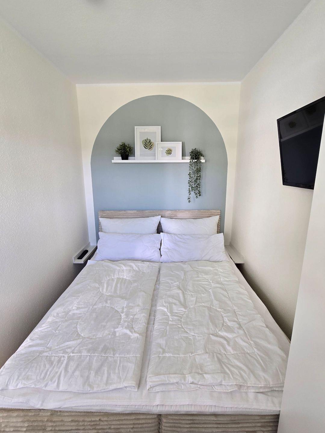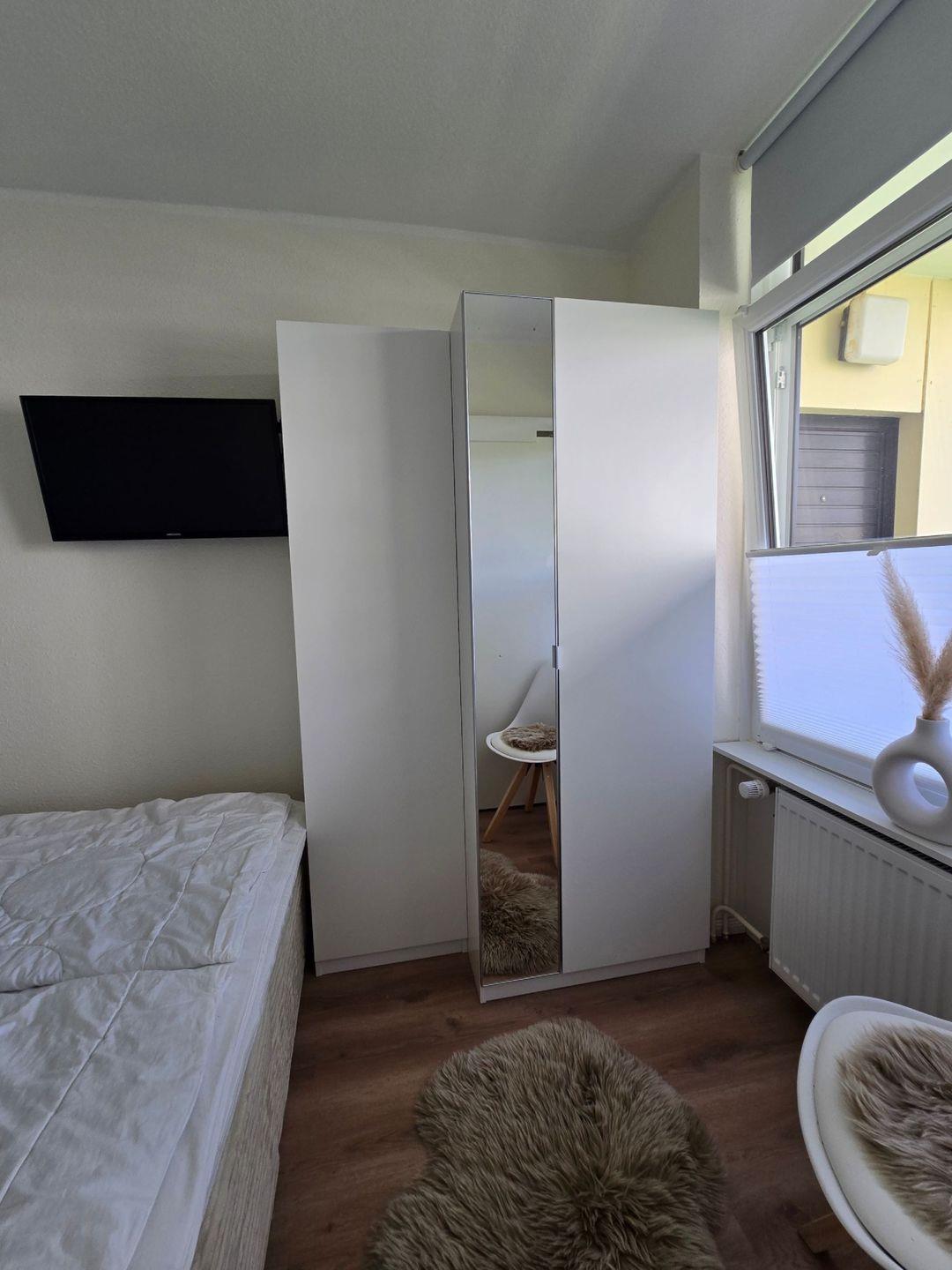 Das separate Schlafzimmer, ebenfalls mit Vinylboden, bietet erholsamen Schlafkomfort. Die Unterkunft verfügt über ein modernes Badezimmer mit Dusche, WC, Waschbecken und Spiegel. Für zusätzlichen Komfort gibt es Sichtschutz an allen Fenstern, einen Garderobenbereich und einen praktischen Schuhschrank.