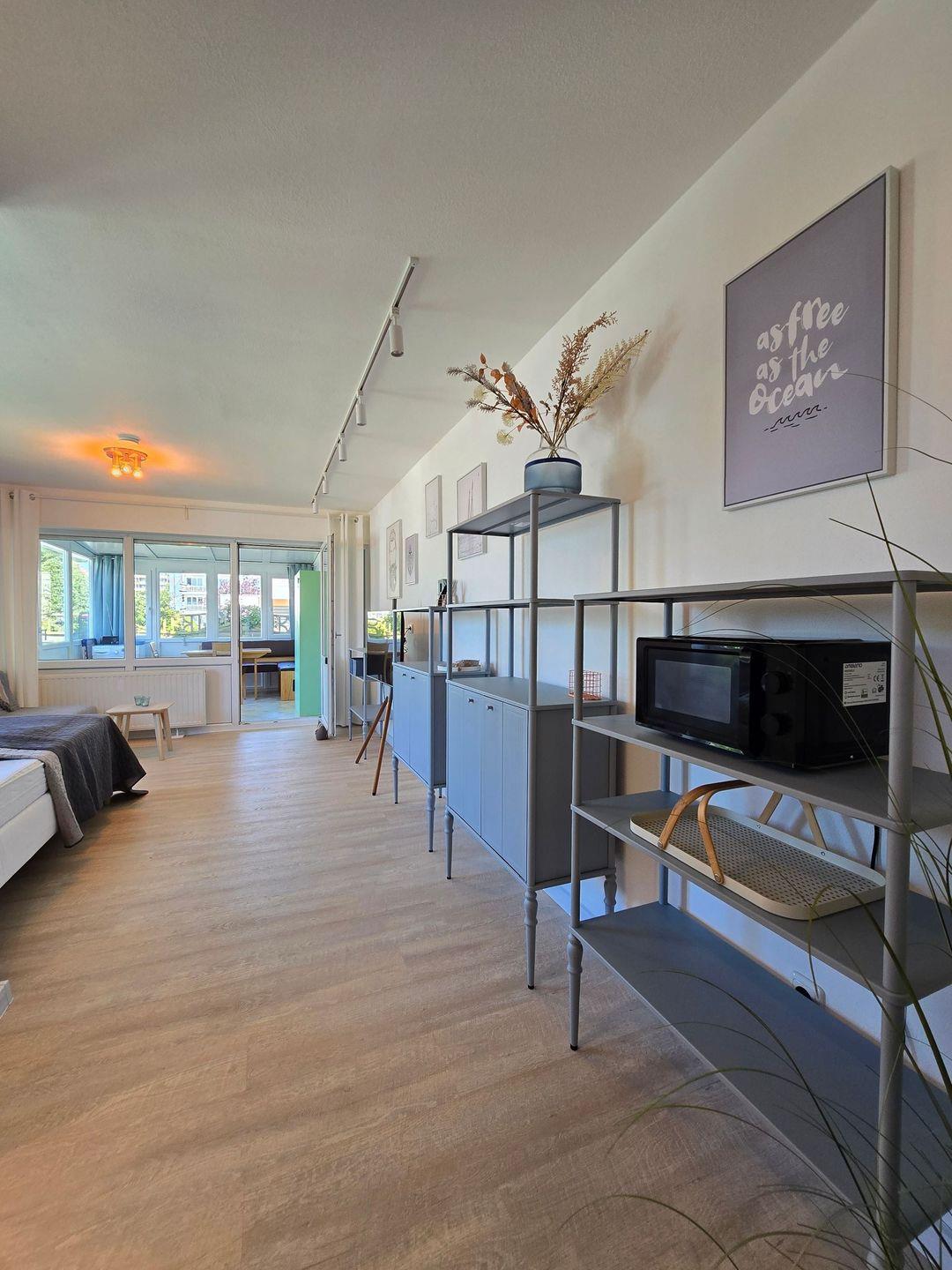 Die lichtdurchflutete Wohnung befindet sich im Erdgeschoss und ist besonders für Paare, Familien und auch Gäste mit Hund geeignet. Maximal fünf Schlafmöglichkeiten stehen zur Verfügung. Das Schlafzimmer ist funktional eingerichtet und wird durch den gemütlichen Wohn- und Essbereich ergänzt, der mit einem Sofa, Kommoden und TV zum Entspannen einlädt. Für geruhsame Nächte stehen Ihnen Boxspringbetten zu Verfügung.