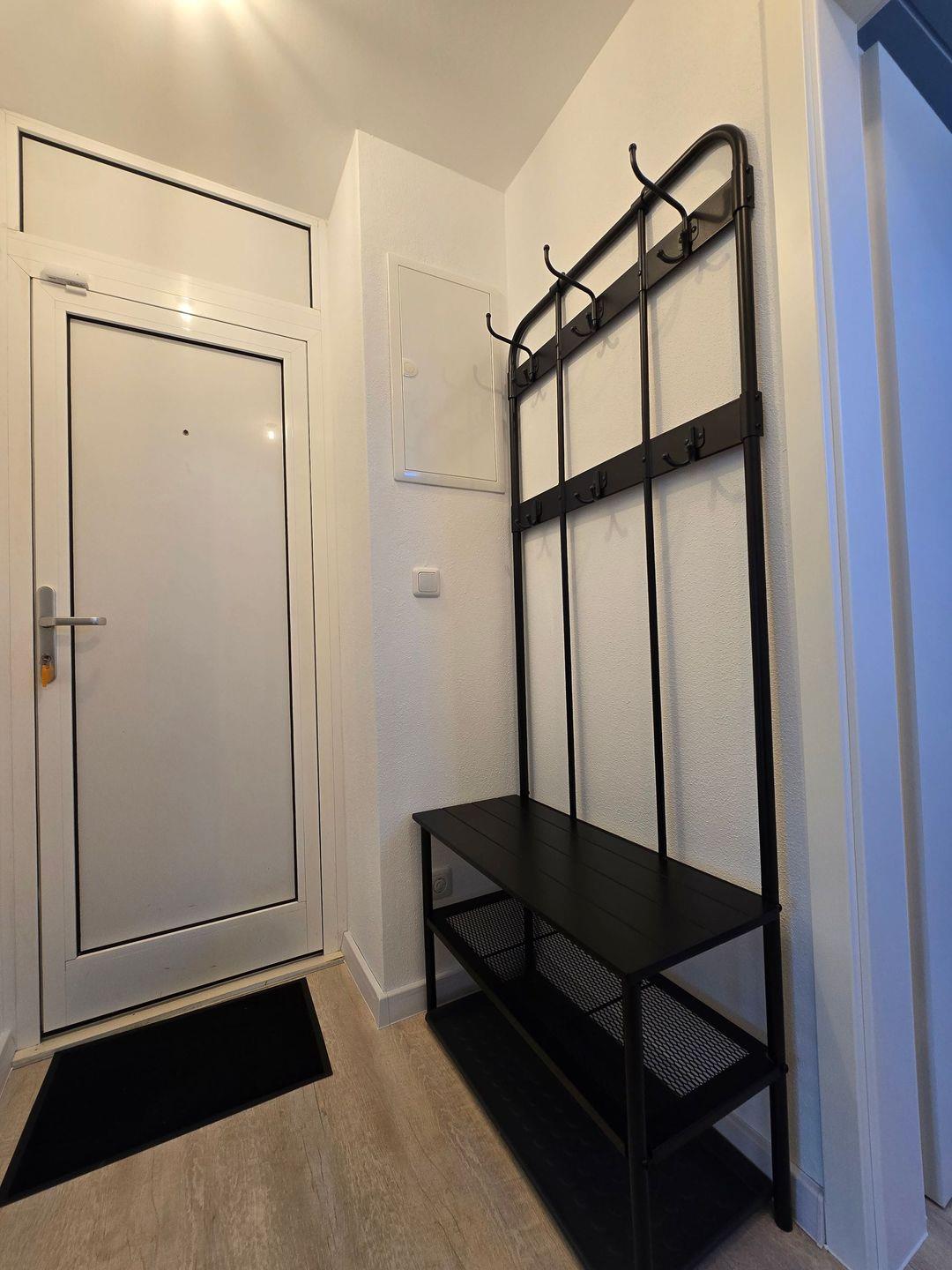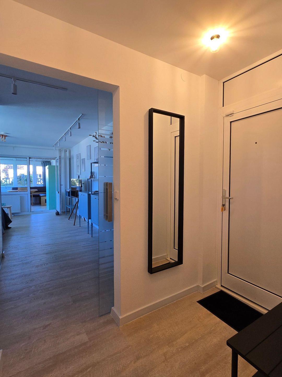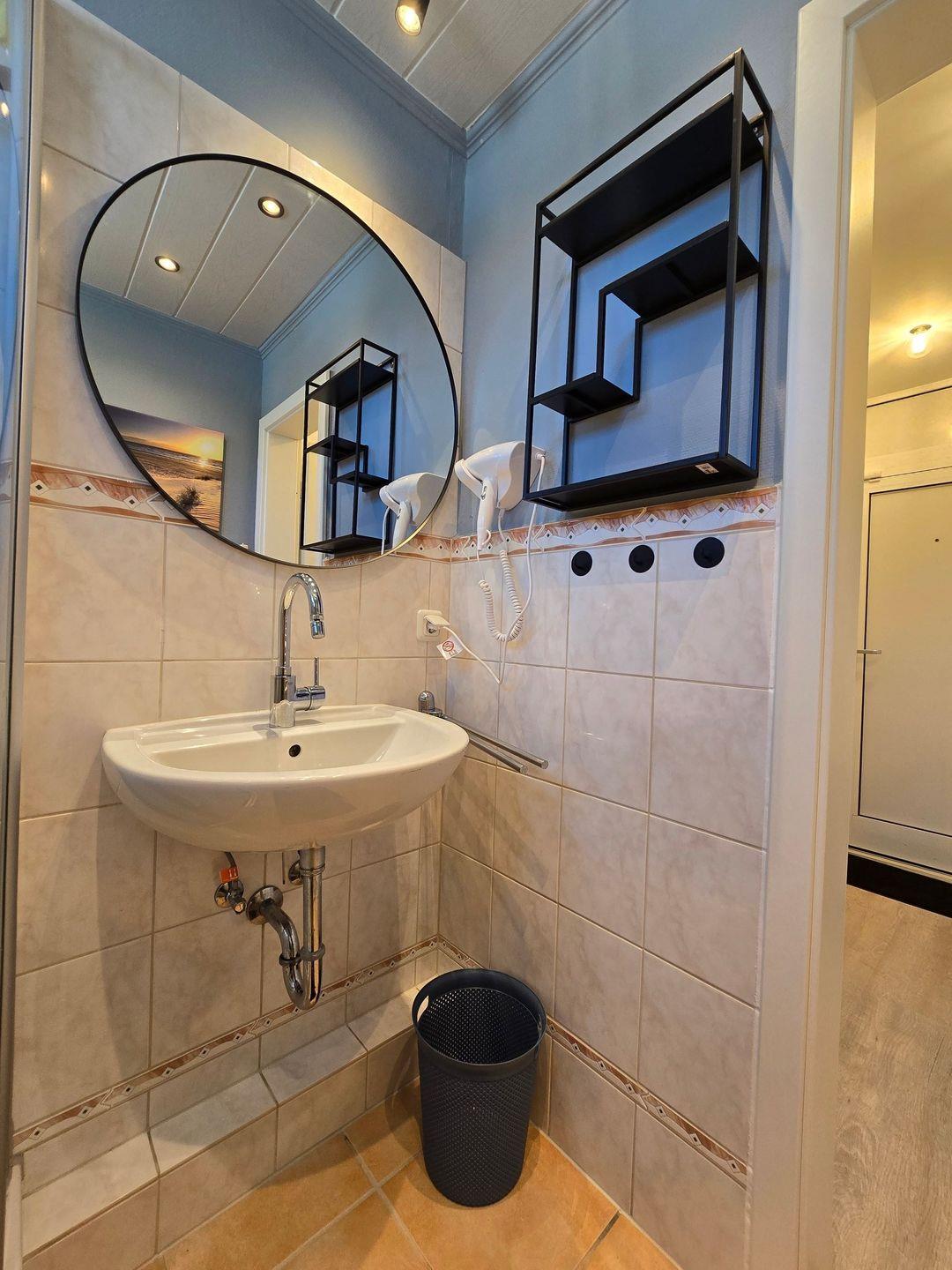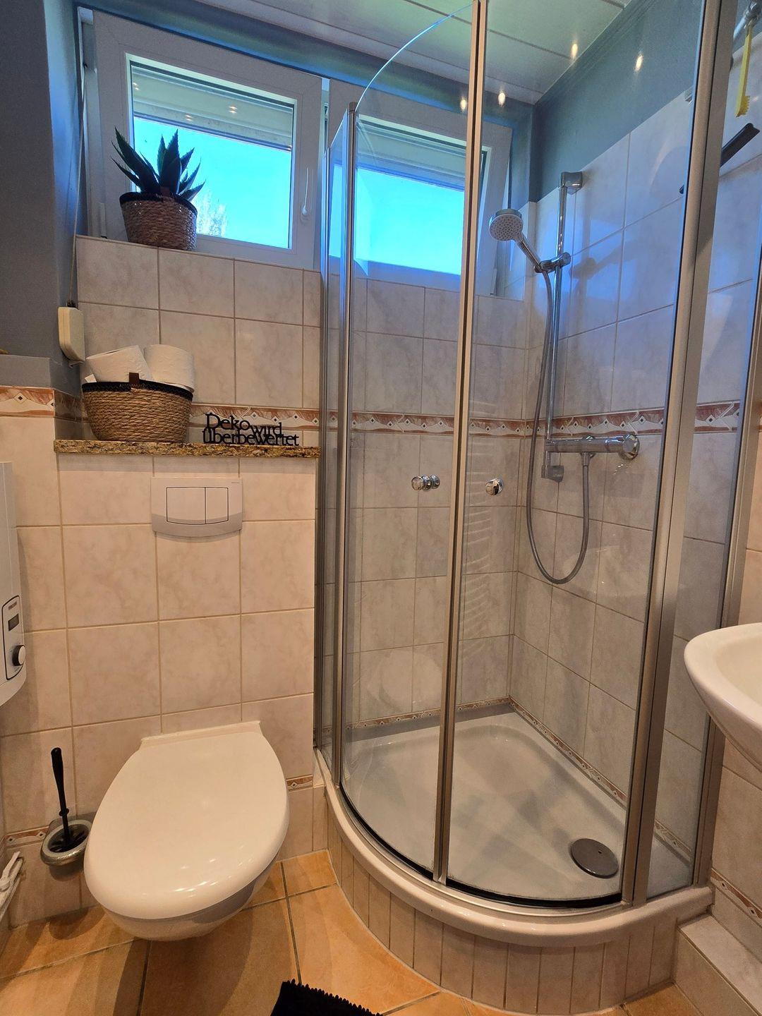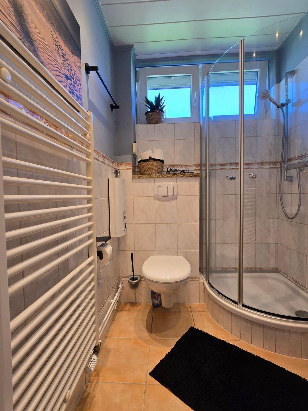 Im Badezimmer mit Fenster erwartet Sie eine Dusche, ein Handtuchheizkörper, ein Fön sowie Ablagemöglichkeiten. Praktische Details wie ein Ganzkörperspiegel, ein Wäscheständer sowie die vorhandene Waschmaschine und der Trockner sorgen für zusätzlichen Komfort und Flexibilität, gerade bei längeren Aufenthalten oder mit Kindern.