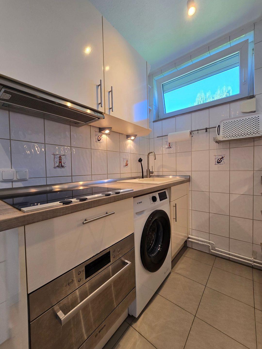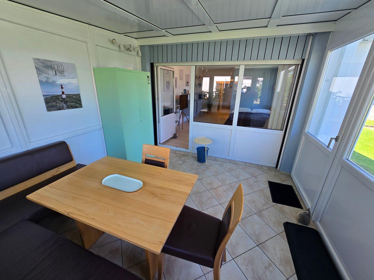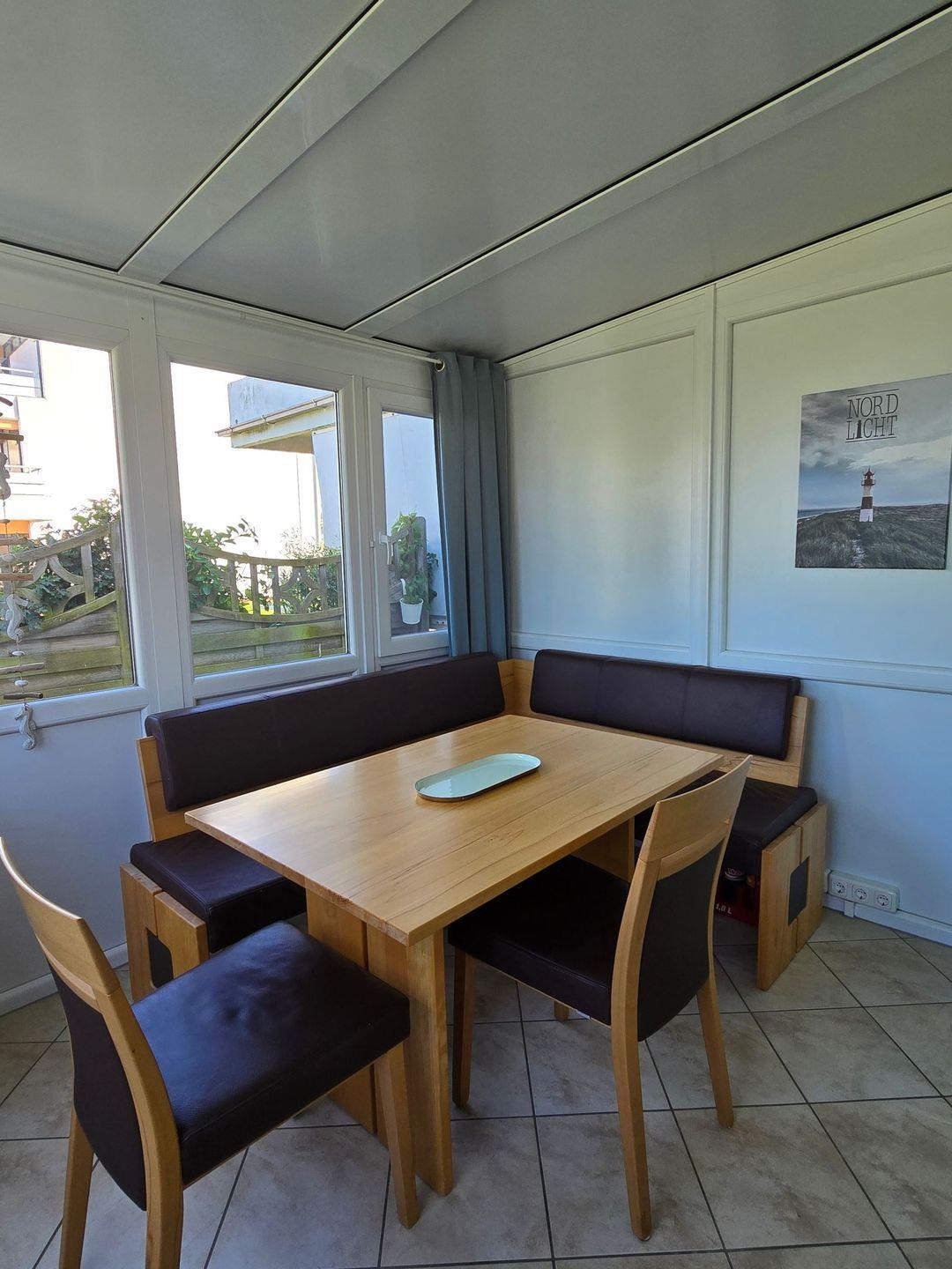 Die offene Küche ist modern ausgestattet und lässt keine Wünsche offen. Hier finden Sie einen 4er Induktionsfeld mit Backofen, Kühlschrank mit Gefrierfach, Spülmaschine, Kaffeemaschine, Toaster, Wasserkocher sowie sämtliches Geschirr, Besteck und Küchenutensilien, die Sie für einen angenehmen Aufenthalt benötigen. Für ein gemeinsames Frühstück oder Abendessen bietet der Essbereich im Wintergarten (mit Fussbodenheizung) ausreichend Platz.