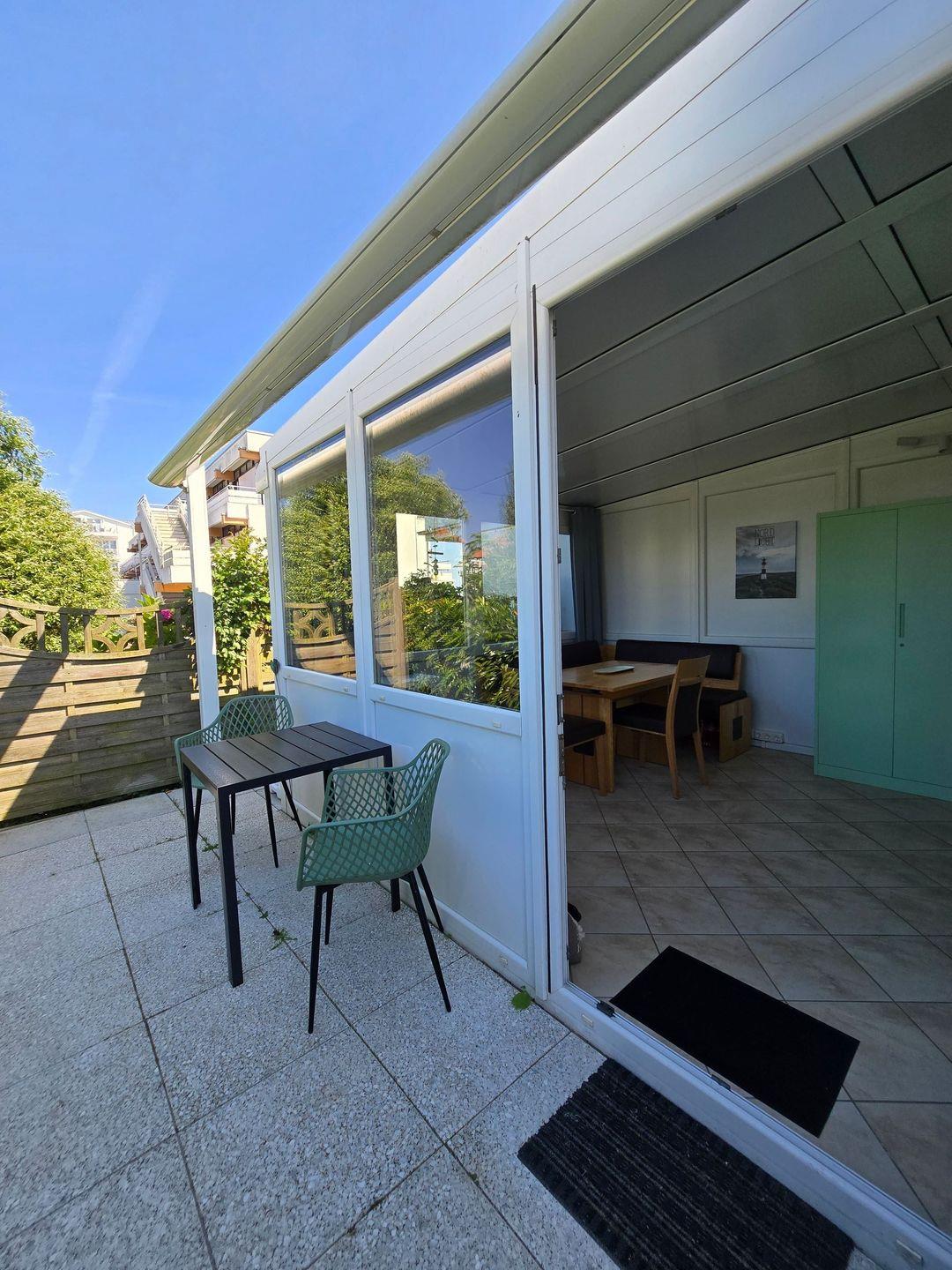 Ein besonderes Highlight ist der mit Gartenmöbeln und Sonnenschirm ausgestattete Terrassenbereich sowie der angrenzende Wintergarten. Dank der Parterre-Lage ist die Terrasse bequem erreichbar und bietet einen schönen Rückzugsort im Freien. Alle Fenster der Unterkunft sind mit Sichtschutz ausgestattet und garantieren Privatsphäre während Ihres Urlaubs. Sollten Sie mit dem eigenen Auto anreisen, steht ein kostenloser Privatparkplatz zur Verfügung.
