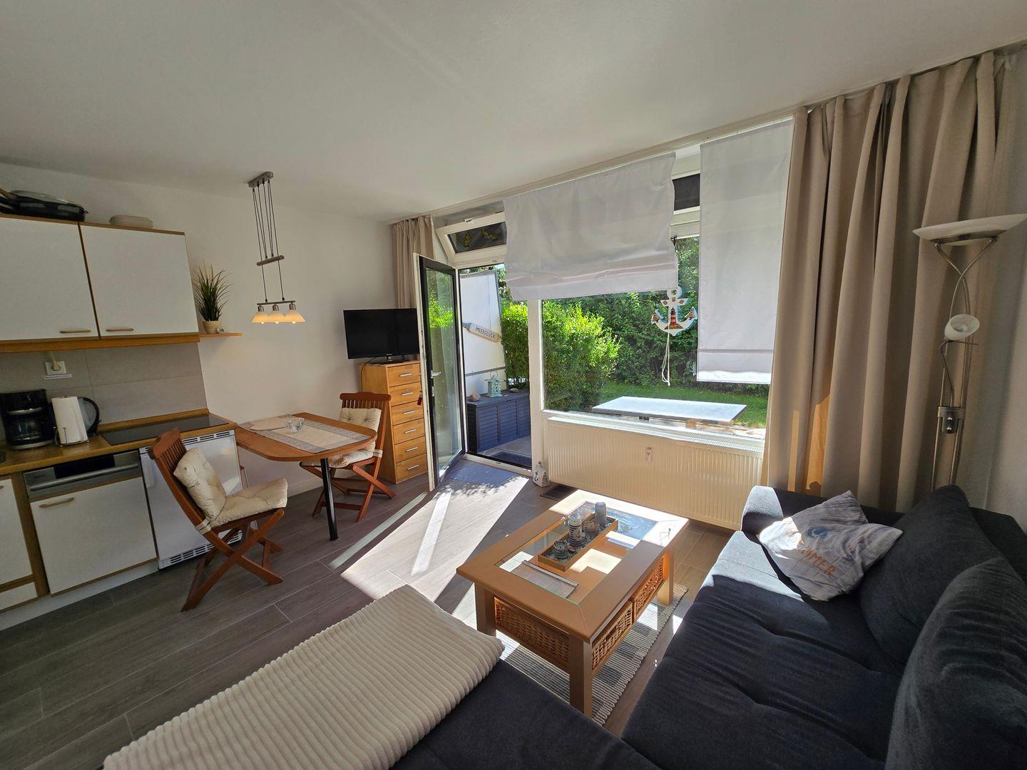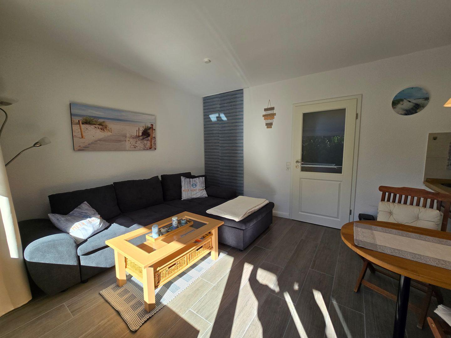 Der helle Wohnbereich besticht durch eine Sofaecke, einen Flachbildfernseher sowie eine offene, komplett ausgestattete Küche. Die Küchenzeile ist mit Spülmaschine, Herd, Kühlschrank mit Gefrierfach, Kaffeemaschine, Toaster, Wasserkocher und zahlreichen Küchenutensilien umfangreich ausgestattet. Ein Esstisch und ein separater Essbereich laden zum Verweilen und zu gemeinsamen Mahlzeiten ein.