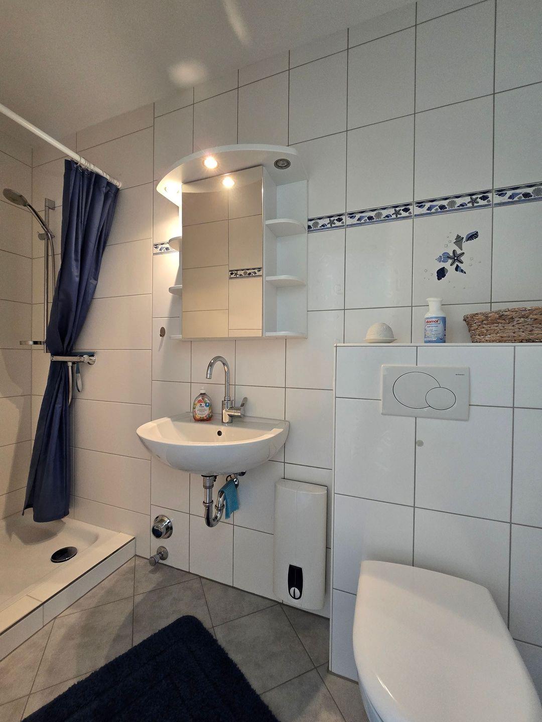 Das Badezimmer ist funktional eingerichtet und bietet eine Dusche, ein Waschbecken und einen Spiegel. Für Ihren Komfort stehen im Haus eine gemeinschaftlich nutzbare Waschmaschine und ein Trockner bereit, sodass auch längere Aufenthalte unkompliziert möglich sind.
