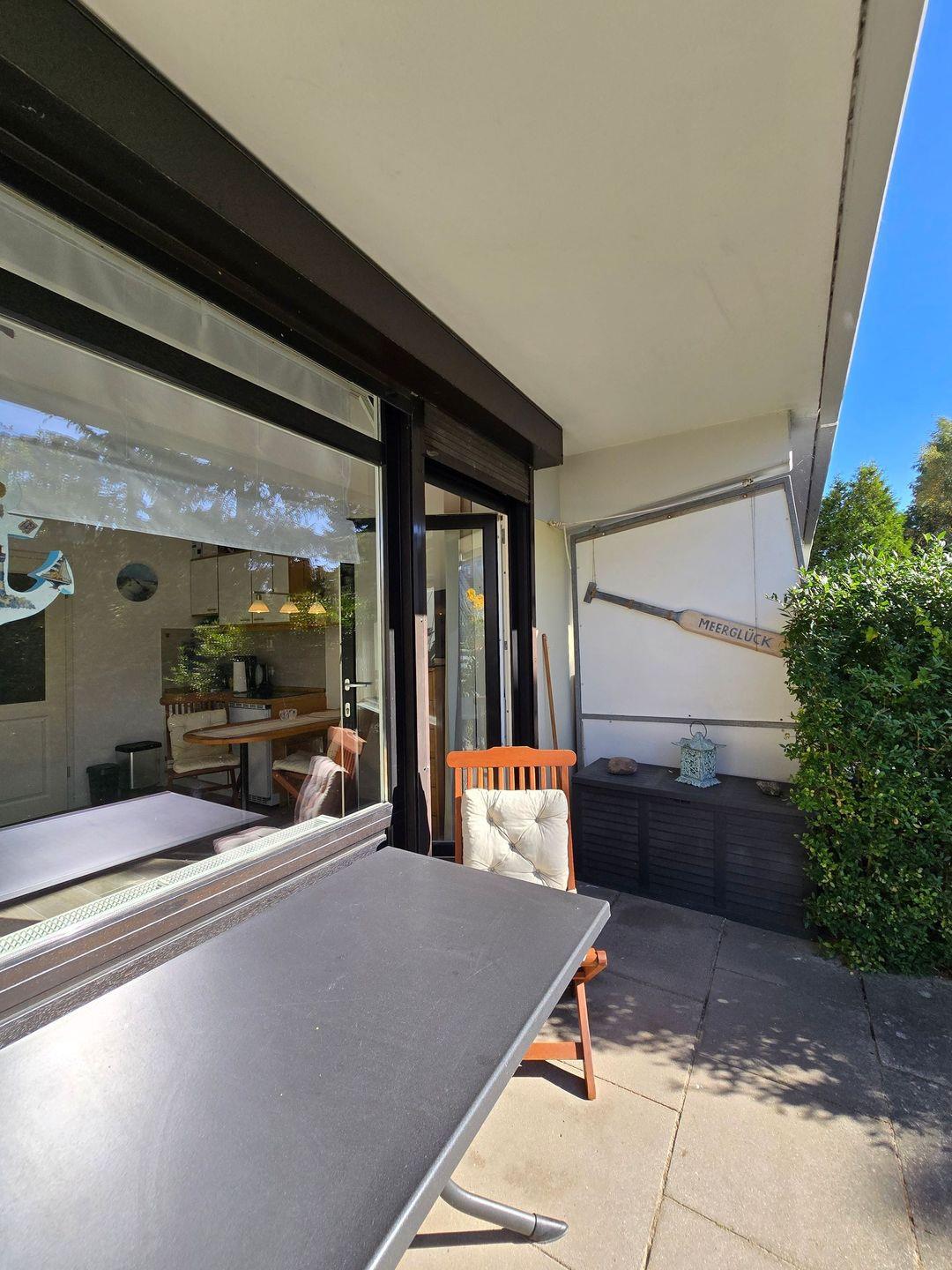 Ein wesentliches Highlight ist die überdachte Terrasse, welche mit Gartenmöbeln ausgestattet ist und einen angenehmen Rückzugsort mit Gartenblick bietet. Bei gutem Wetter können Sie hier entspannte Stunden bei Meeresrauschen verbringen – die Jalousie sorgt für Privatsphäre.