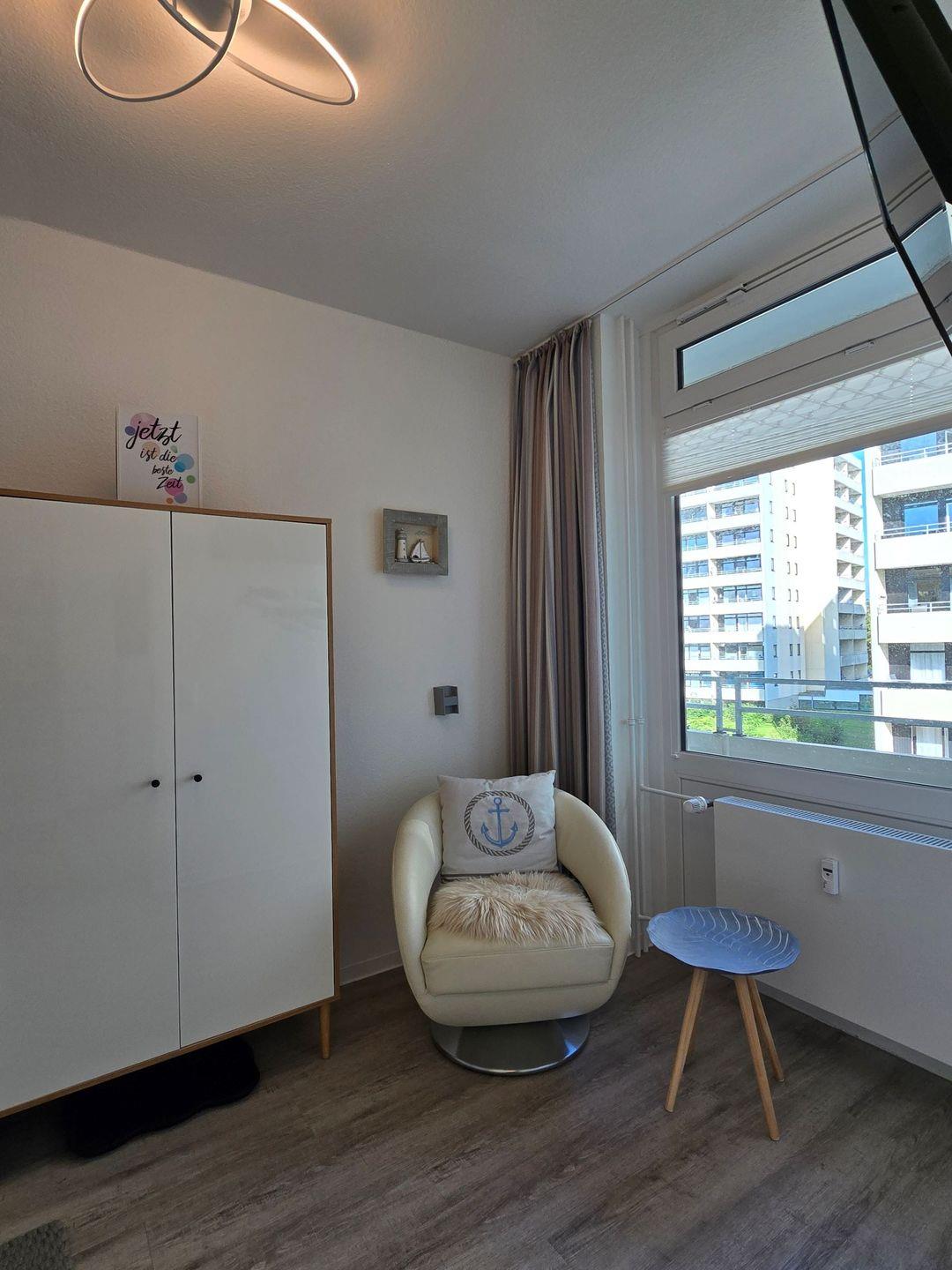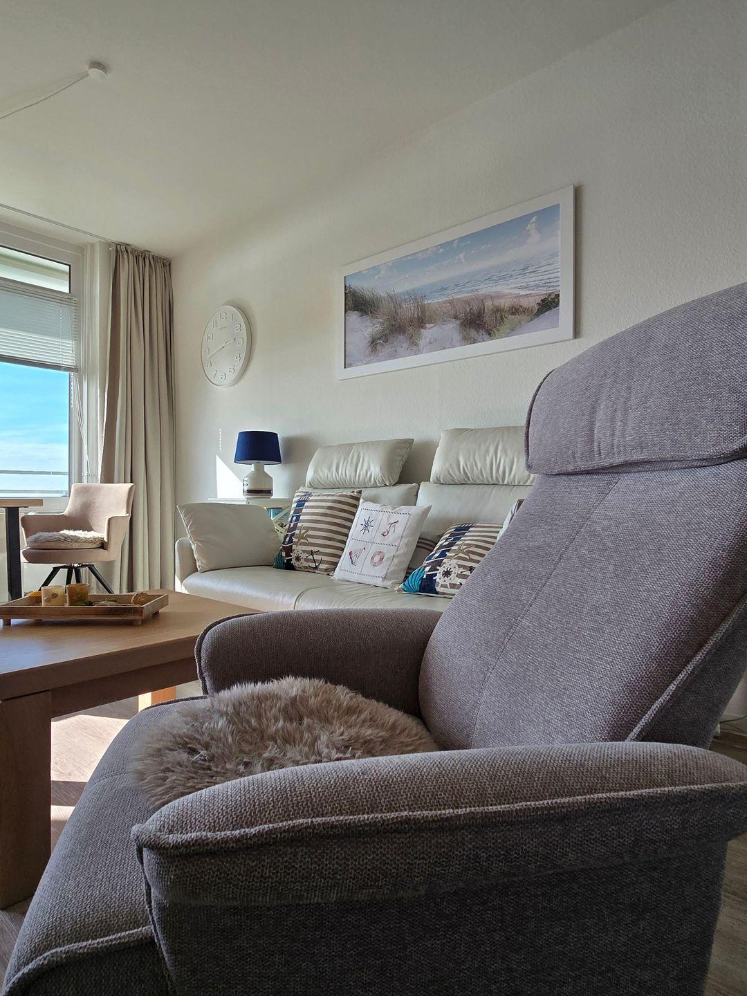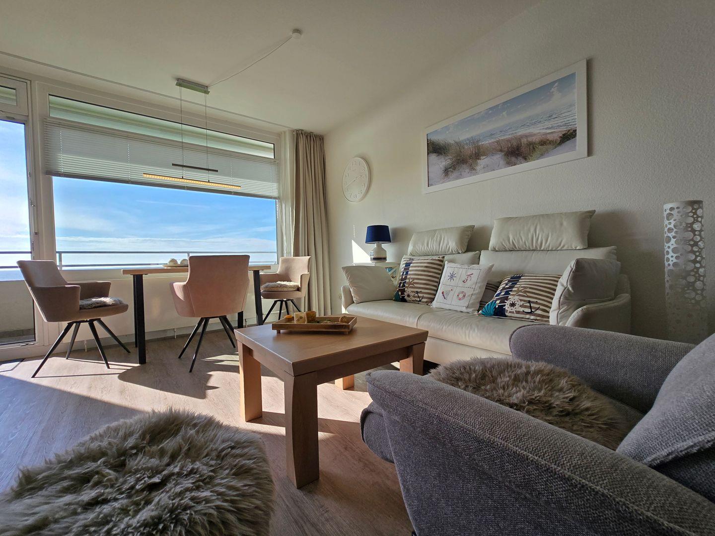 Ein gemütliches Wohnzimmer mit TV, Radio, Sofa und Sesseln sorgt für angenehme Stunden am Tag. Große Fenster mit Sichtschutz garantieren Privatsphäre und eröffnen gleichzeitig einen eindrucksvollen Ausblick auf das Meer. Ein großzügiger Esstisch schafft ideale Voraussetzungen für gemeinsame Mahlzeiten und im hochwertigen Boxspringbett (180 x 200cm mit durchgehender Matratze) steht Schlafkomfort an erster Stelle.