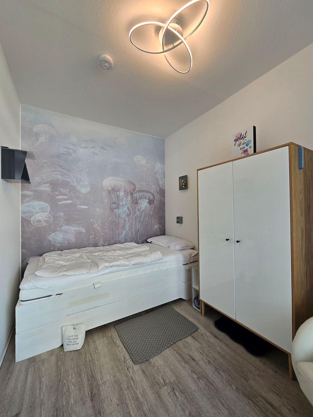 Der überdachte Balkon ist mit Gartenmöbeln und Sonnenschutz ausgestattet und bietet Ihnen die Gelegenheit, zu jeder Tageszeit die frische Ostseeluft und den außergewöhnlichen Meerblick zu genießen. Das separate gemütliche Schlafzimmer (2 Matratzen mit 0,90 * 200cm) ist mit einem weiteren TV ausgestattet und lädt zu erholsamen Nächten ein.