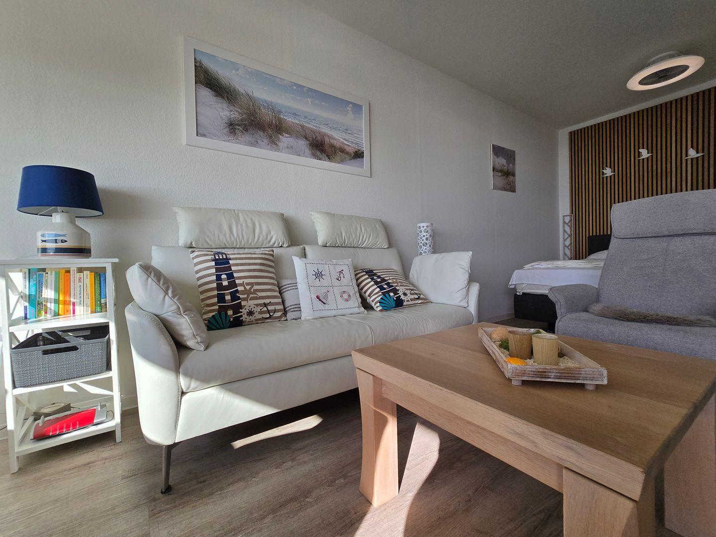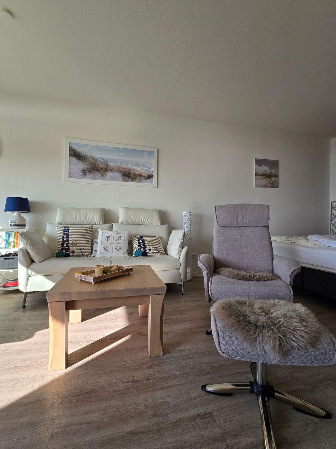 Die Ferienwohnung Wellenklang in Großenbrode bietet modernen Komfort und Meerblick nur 50 Meter vom Strand entfernt.