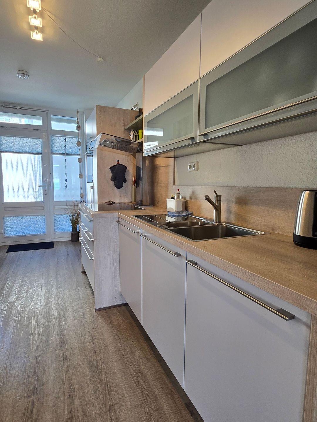 Die geschlossene, voll ausgestattete Küche lässt keine Wünsche offen. Ein Herd, Backofen inklusive Mikrowelle, Kühlschrank, Gefrierfach, Geschirrspüler, Wasserkocher, Kaffeemaschine, Toaster und sämtliche Küchenutensilien stehen Ihnen zur Verfügung. Das neuwertige Bad bietet eine Dusche mit Wanne, ein Waschbecken, WC und großer Spiegelfront. Für Ihren Komfort stehen Waschmaschine und Trockner zur gemeinschaftlichen Nutzung bereit.