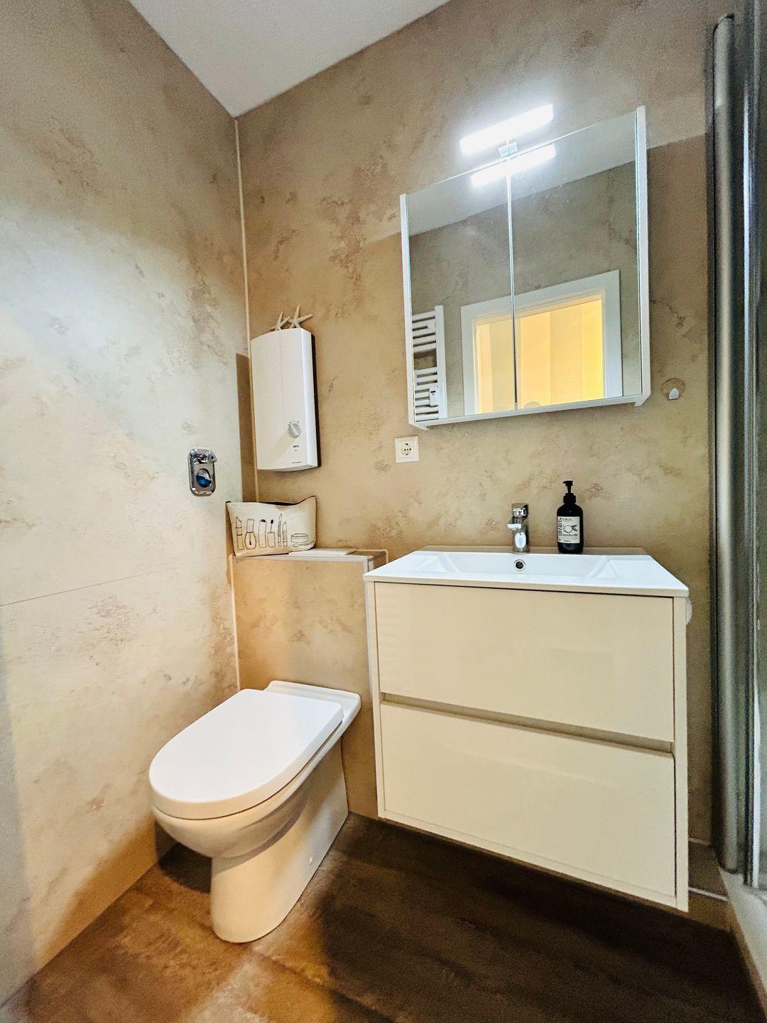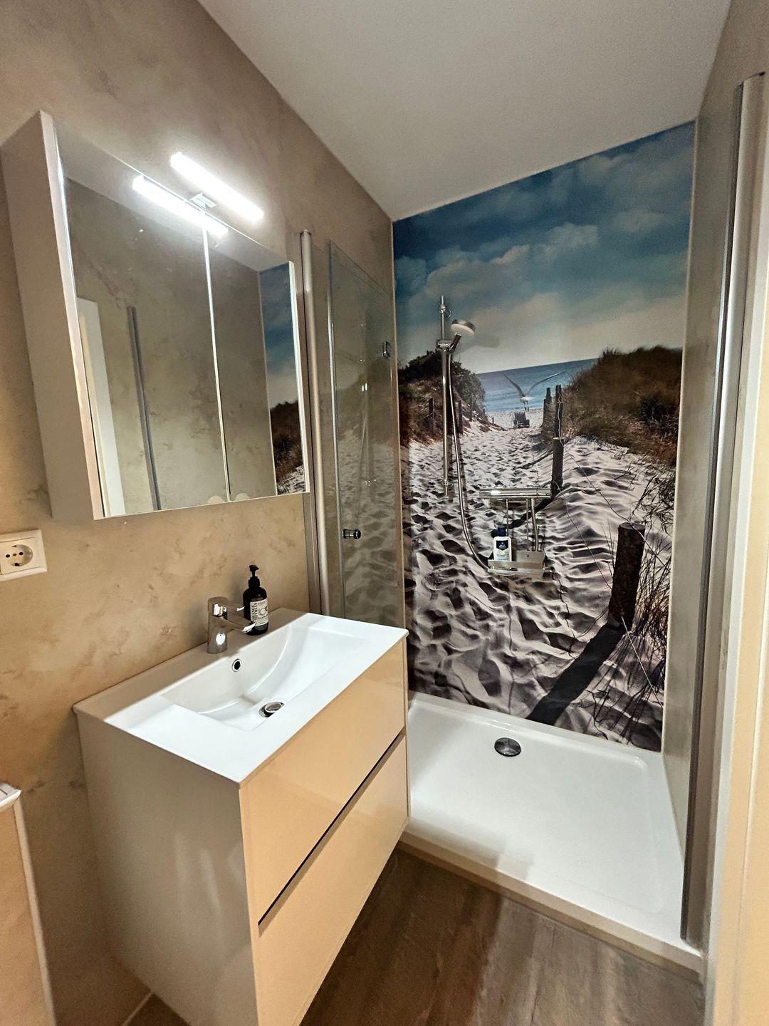 Die Wohnung besitzt ein modernes Badezimmer mit einer bodengleichen Dusche, Waschbecken, Spiegel, WC sowie einem Haartrockner. Waschmaschine und Trockner stehen gemeinschaftlich zur Verfügung und sorgen für zusätzlichen Komfort, ergänzend gibt es Bügelmöglichkeiten.