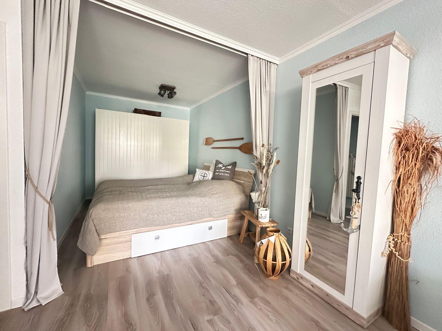 Mit einer Wohnfläche von 46 m² bietet Ihnen die Unterkunft ein helles und offenes Wohnkonzept. Es steht Ihnen ein gemütliches Doppelbett (180*200cm) für erholsame Nächte und ein großer Kleiderschrank für ihre Urlaubsgarderobe zur Verfügung. Der Schlafbereich kann durch einen Vorhang abgetrennt werden. Für weiteres Wohlbefinden sorgt die gemütliche Sofa-Ecke (ausziehbar auf 140*200cm) im angrenzenden Wohnbereich, der offen in den Essbereich und die Küche übergeht. Die offene Küche ist voll ausgestattet und verfügt unter anderem über einen 2-Platten-Herd, externes Ceranfeld, Backofen, Kühlschrank mit Gefrierfach, Mikrowelle, Toaster, Kaffeemaschine sowie eine Nespresso-Espressomaschine. Zeitgemäße Küchengeräte, Geschirr und sämtliche Utensilien sind selbstverständlich vorhanden. Der Esstisch im Wohnbereich schafft Raum für gemeinsame Mahlzeiten in entspannter Runde.