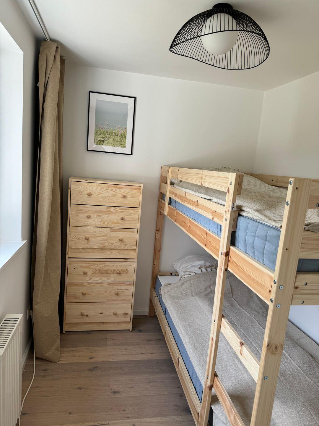 Der komfortabel gestaltete Innenbereich gliedert sich in insgesamt drei Zimmer, darunter zwei separate Schlafzimmer (eines mit Doppelbett und eines mit Etagenbett) und ein gemütliches Wohnzimmer mit Sofaecke, Esstisch, Sessel und TV. Die offene Küche ist zum Wohnbereich hin ausgerichtet und modern ausgestattet: Neben Ceran-Herd, Backofen, Mikrowelle, Spülmaschine und Kühlschrank mit Gefrierfach findest du hier eine klassische Kaffeemaschine und eine Nespresso-Espressomaschine – ideal für gelungene Urlaubstage mit individuellen Genussmomenten. Ein Wasserkocher und Toaster stehen ebenfalls zur Verfügung.