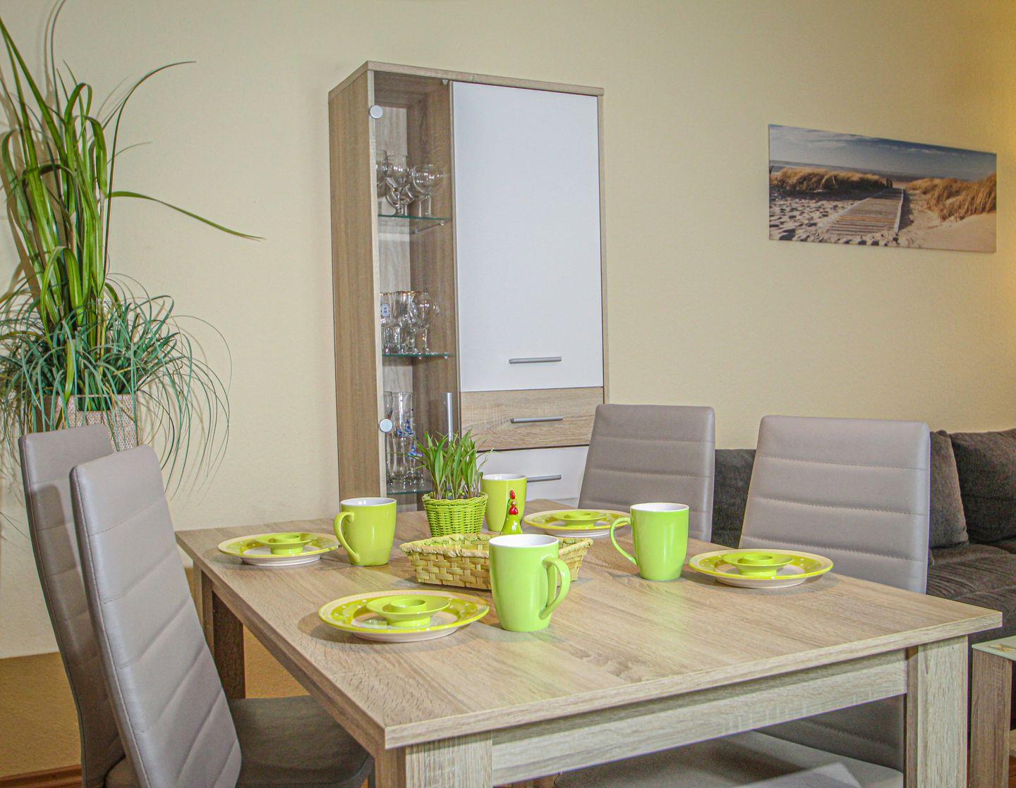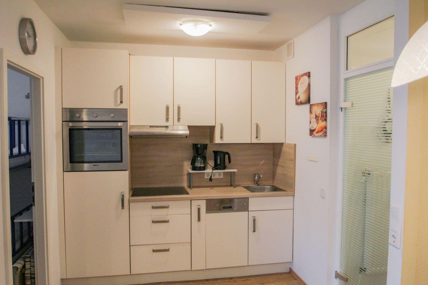 Die offene Küche ist modern ausgestattet und in den Wohnraum integriert. Hier finden Sie einen Cerankochfeld, Backofen, einen Kühlschrank mit Gefrierfach, eine Spülmaschine, einen Wasserkocher, Toaster, Kaffeemaschine, sowie eine Senseo-Espressomaschine. Mit vollständigem Geschirr, Besteck und diversen Küchenutensilien steht einer komfortablen Selbstversorgung nichts im Wege. Angrenzend zur Küche liegt der Essbereich mit Esstisch.