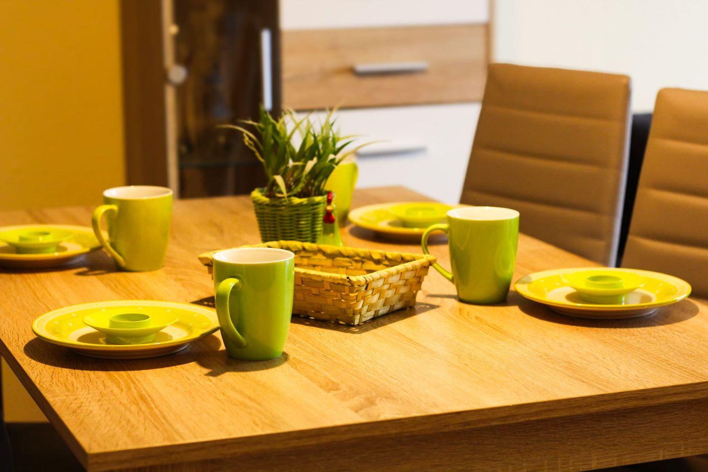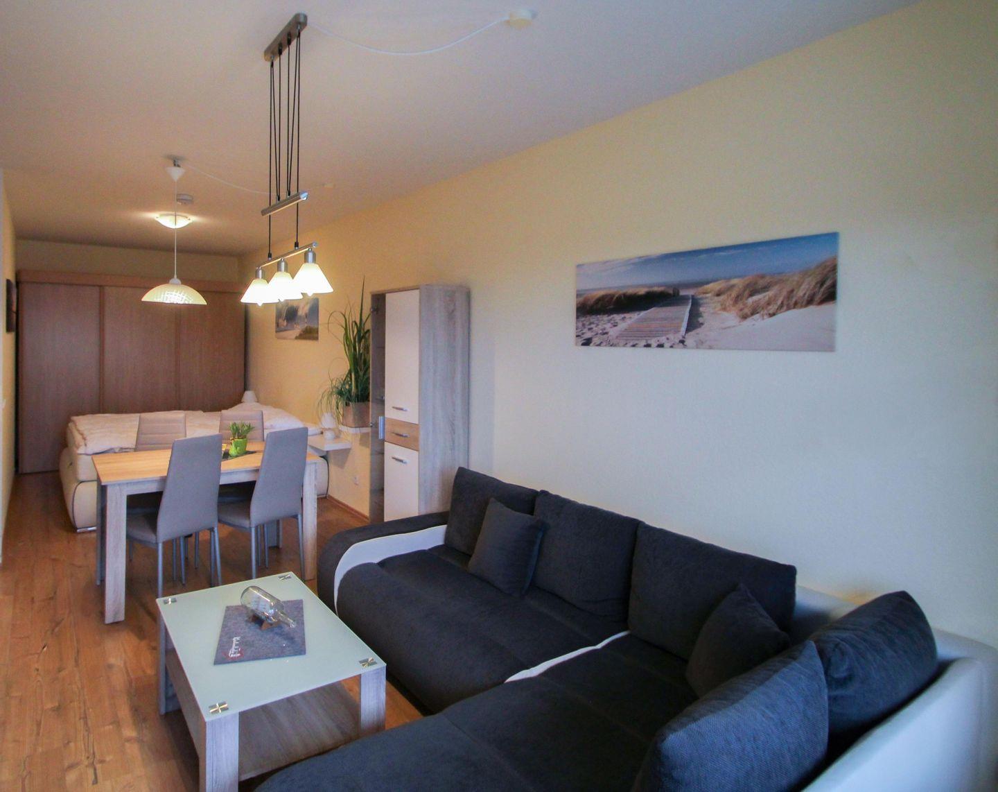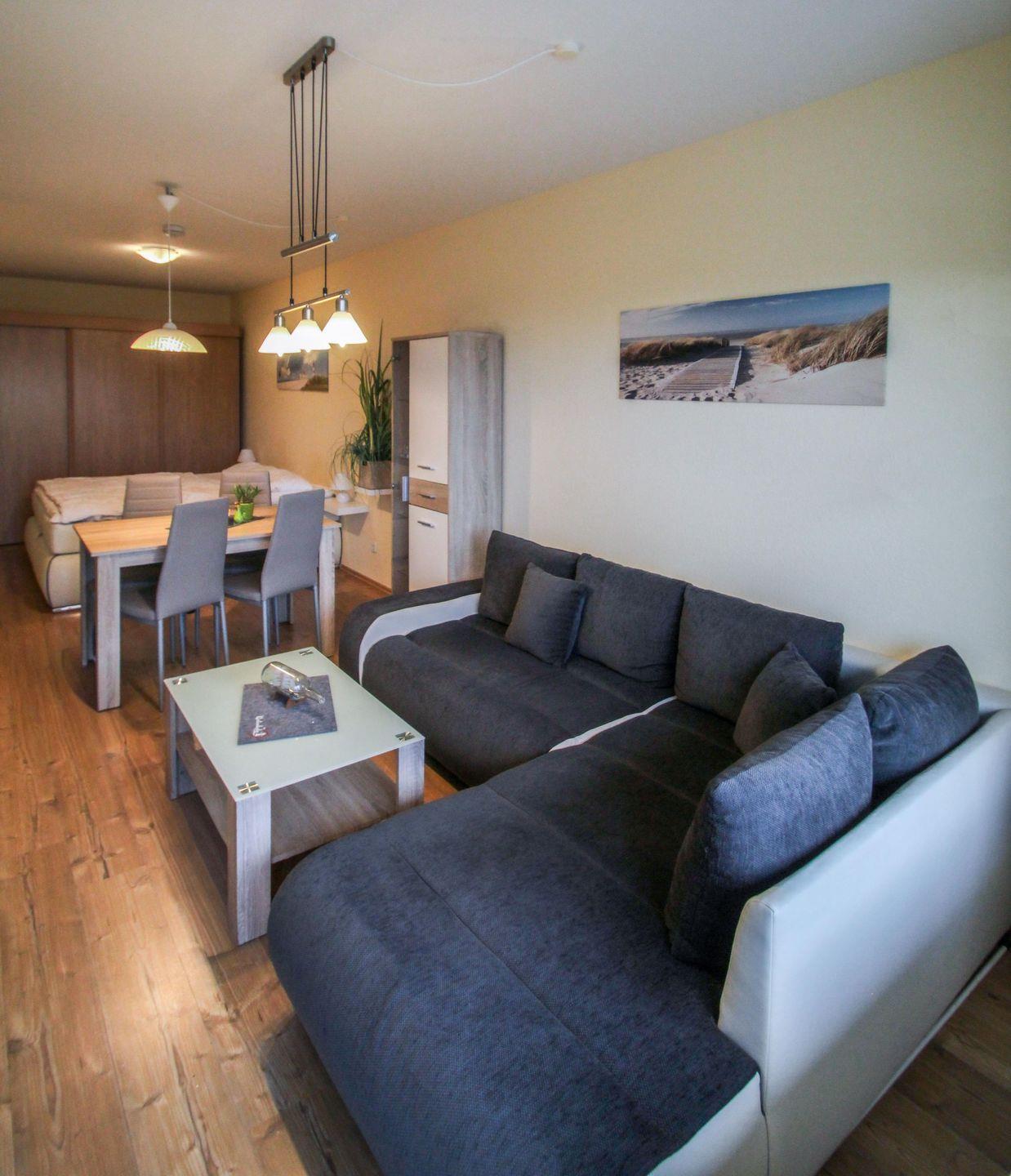 Das großzügige Wohnzimmer ist mit Laminatboden ausgestattet und lädt mit einer gemütlichen Sofaecke sowie einem TV zum Entspannen ein. Für Unterhaltung sorgen zudem ein zweiter Fernseher, eine Musikanlage, ein DVD- und Blu-ray-Player, ein CD-Player sowie ein Radio. WLAN steht Ihnen selbstverständlich zur Verfügung, sodass Sie auch im Urlaub mit der Welt verbunden bleiben können. Alle Fenster der Wohnung sind mit Sichtschutz ausgestattet, sodass Sie Ihre Privatsphäre zu jeder Zeit genießen können.
