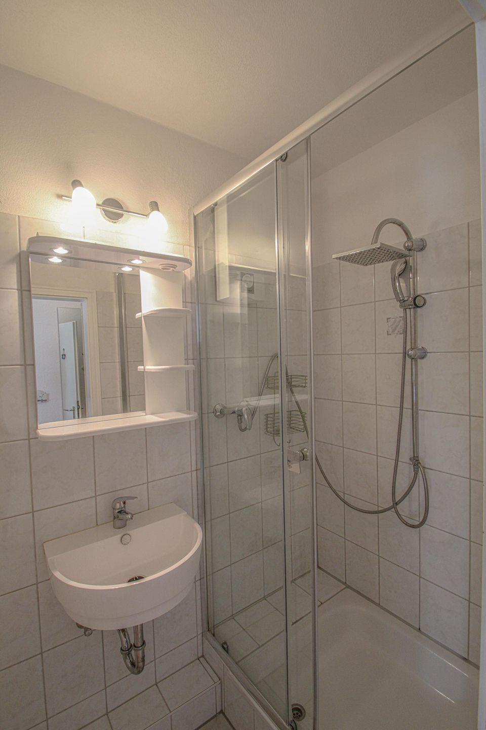 Das Bad verfügt über eine Dusche mit Wanne, ein Waschbecken, Spiegel sowie ein WC. Eine gemeinschaftlich nutzbare Waschmaschine und ein Trockner stehen im Gebäude zur Verfügung. Für zusätzlichen Komfort finden Sie in der Wohnung ein Bügeleisen, Wäscheständer und Staubsauger.