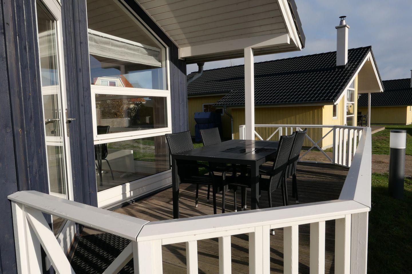 Bitte beachten Sie: Manche Häuser verfügen über ein Geländer um die Terrasse herum, andere nicht. Bei den Außen- und Innenbildern handelt es sich um Modellbilder unterschiedlicher Ferienhäuser.