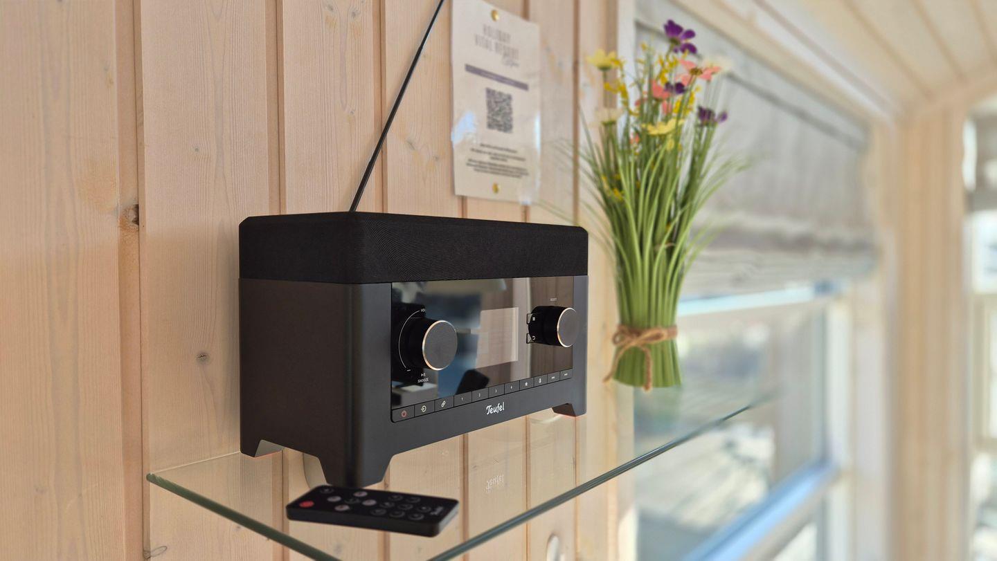 Im Wohnbereich befinden sich der Kaminofen, der Flachbild Sat-TV, ein DVD-Player bzw. Blue-Ray Player, eine hochwertige Teufel Anlage (Radio mit FM, DAB/DAB+, USB Wiedergabe, Bluetooth).