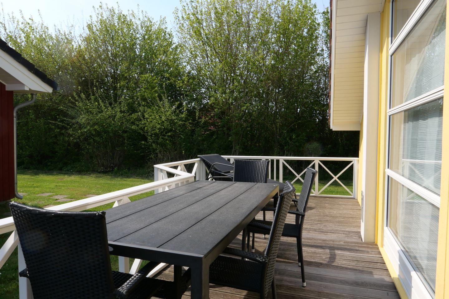 Vom Wohnbereich aus haben Sie Zugang zur teils überdachten, mit Gartentisch und Stühlen möblierten Terrasse, auf der Sie die langen Sommerabende genießen können. 2 Sonnenliegen stehen Ihnen ebenfalls zur freien Verfügung.