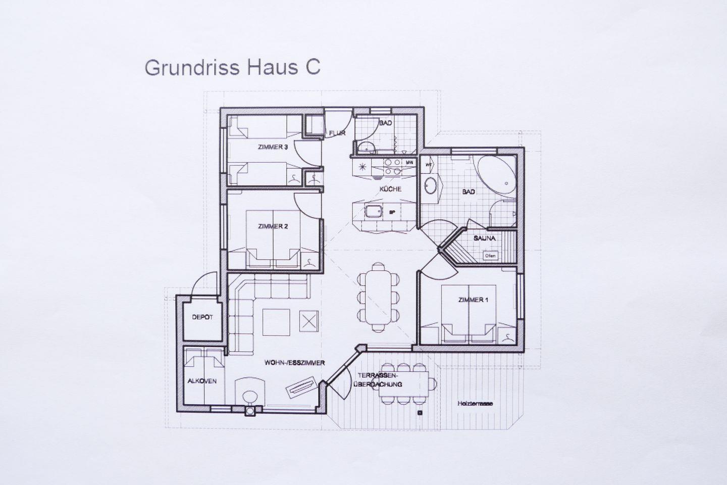 Bitte beachten Sie: Manche Häuser verfügen über ein Geländer um die Terrasse herum, andere nicht. Bei den Außen- und Innenbildern handelt es sich um Modellbilder unterschiedlicher Ferienhäuser.