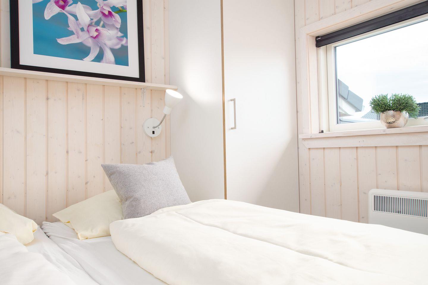 Die 4 Schlafzimmer liegen räumlich versetzt. Ein großes Schlafzimmer mit Doppelbett und ein Schlafzimmer mit Einzelbetten liegen gleich neben dem großen Badezimmer mit Sauna und Dusche. Zwei weitere Schlafzimmer sind mit Doppelbett bzw. 2 Einzelbetten ausgestattet und liegen auf der anderen Seite des Hauses. Im Alkoven befinden sich 2 zusätzliche Schlafplätze mit Doppelbett, die sehr beliebt bei den jüngeren Familienmitgliedern sind. Ein Kinderbett und ein Kinderhochstuhl befinden sich im Haus.