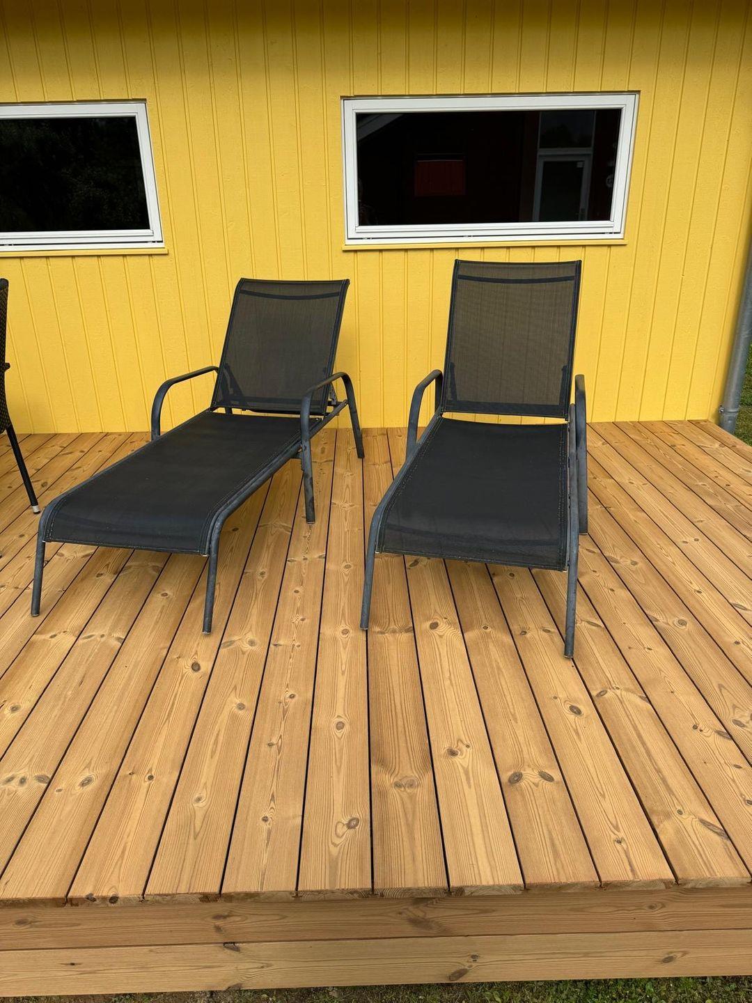 Vom Wohnbereich gelangen Sie direkt auf die teilüberdachte Terrasse mit großem Gartentisch und bequemen Stühlen. Hier genießen Sie entspannte Grillabende, lange Sommernächte oder den ersten Kaffee am Morgen. Zwei Sonnenliegen stehen für Sie bereit.