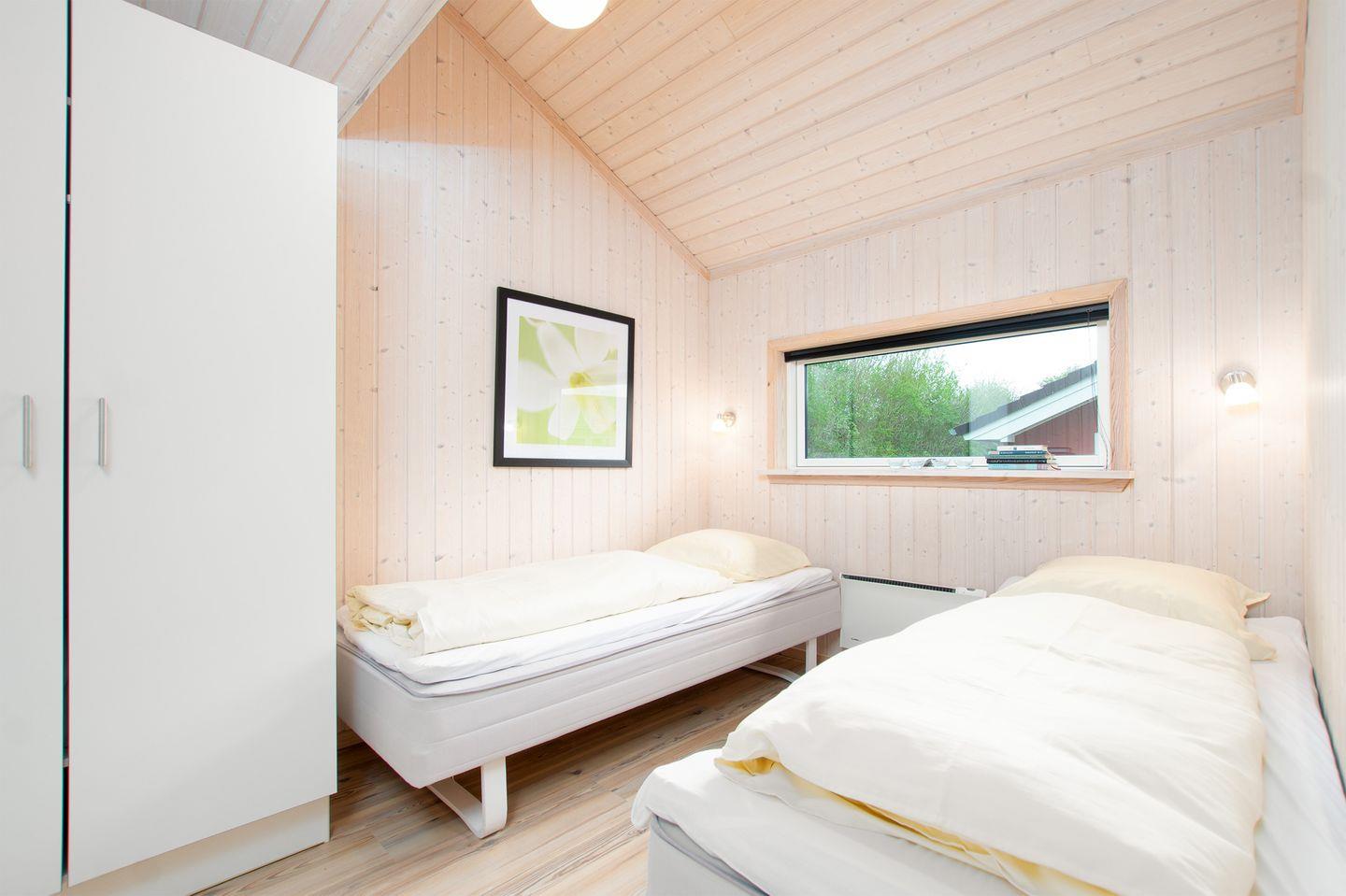Die zwei Bereiche mit insgesamt 4 Schlafzimmern sind räumlich voneinander getrennt und auf gegenüberliegenden Seiten des Hauses platziert. Jeder Schlafbereich beinhaltet jeweils ein Schlafzimmer mit Doppelbett und ein Schlafzimmer mit zwei Einzelbetten. Über einem der Schlafbereiche gibt es zwei extra Schlafplätze auf dem Hems, eine Art Schlafboden. Hier tummeln gerne die Kinder. Zu beiden Schlafbereichen gehört jeweils ein Bad. Das große Badezimmer ist mit Sauna und Dusche ausgestattet und das kleinere Bad mit Dusche. Ein Kinderbett und ein Kinderhochstuhl befinden sich im Haus.