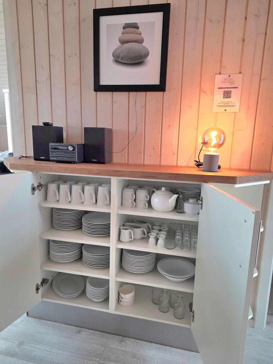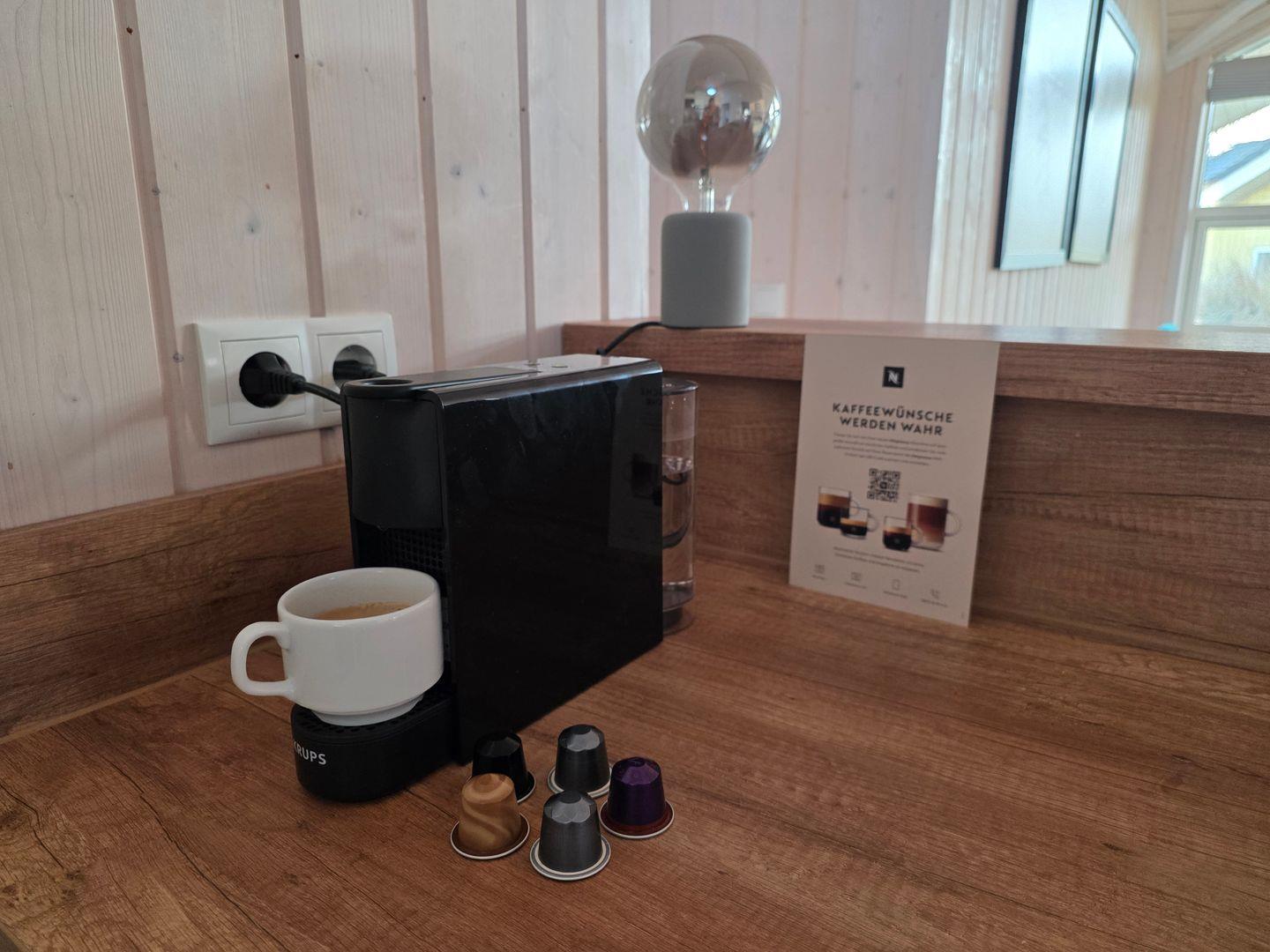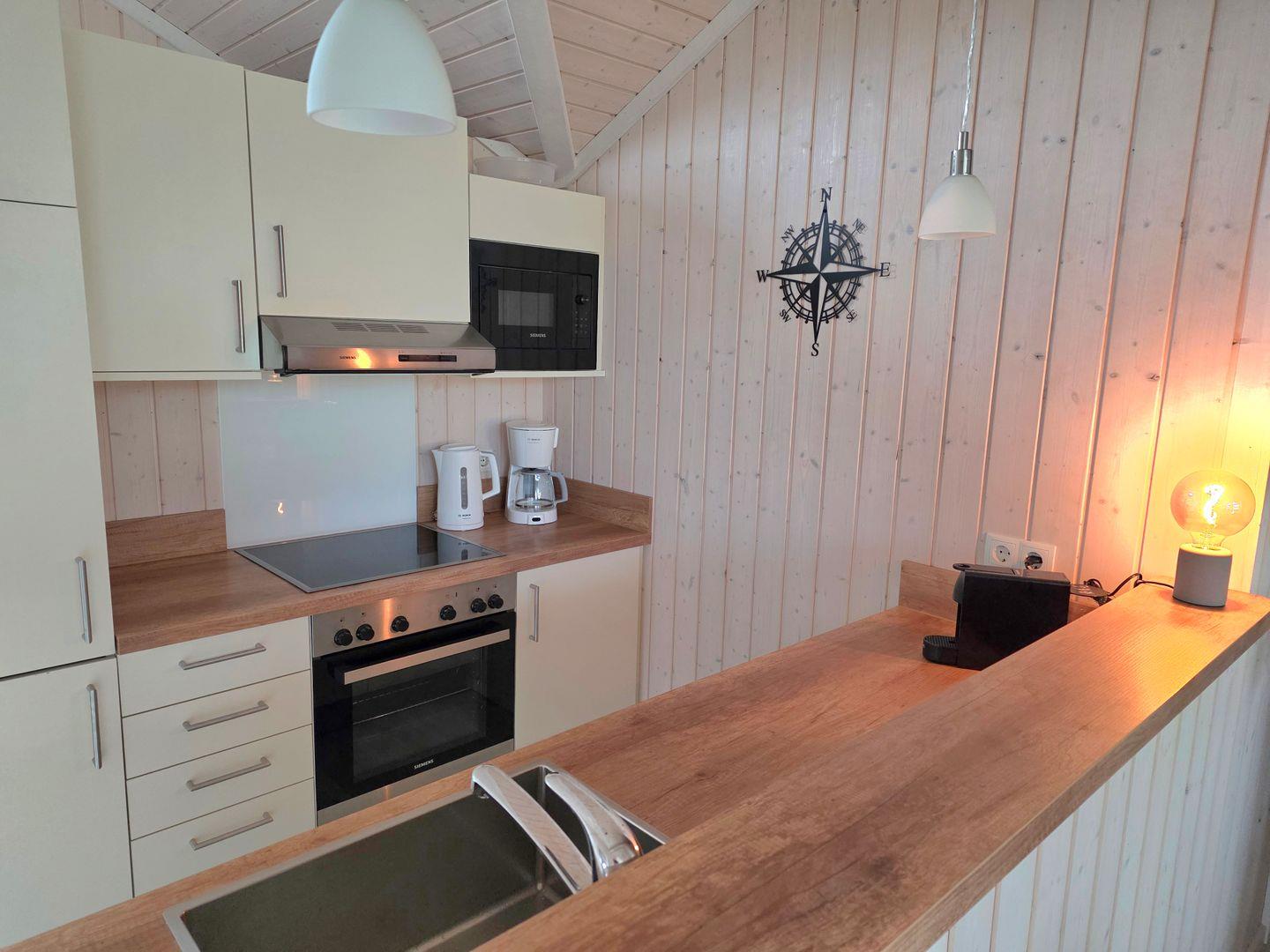 Die offene Küche ist vollwertig ausgestattet mit Spülmaschine, Kühlschrank mit Gefrierfach, Ceranfeld-Herd, Mikrowelle, Wasserkocher, Toaster und Kaffeemaschine. Es stehen ausreichend Geschirr und Gläser zur Verfügung. Neben der Kaffeemaschine ist auch eine Nespresso-Maschine vorhanden, mit der Sie Ihre persönlichen Kaffeespezialitäten genießen können.