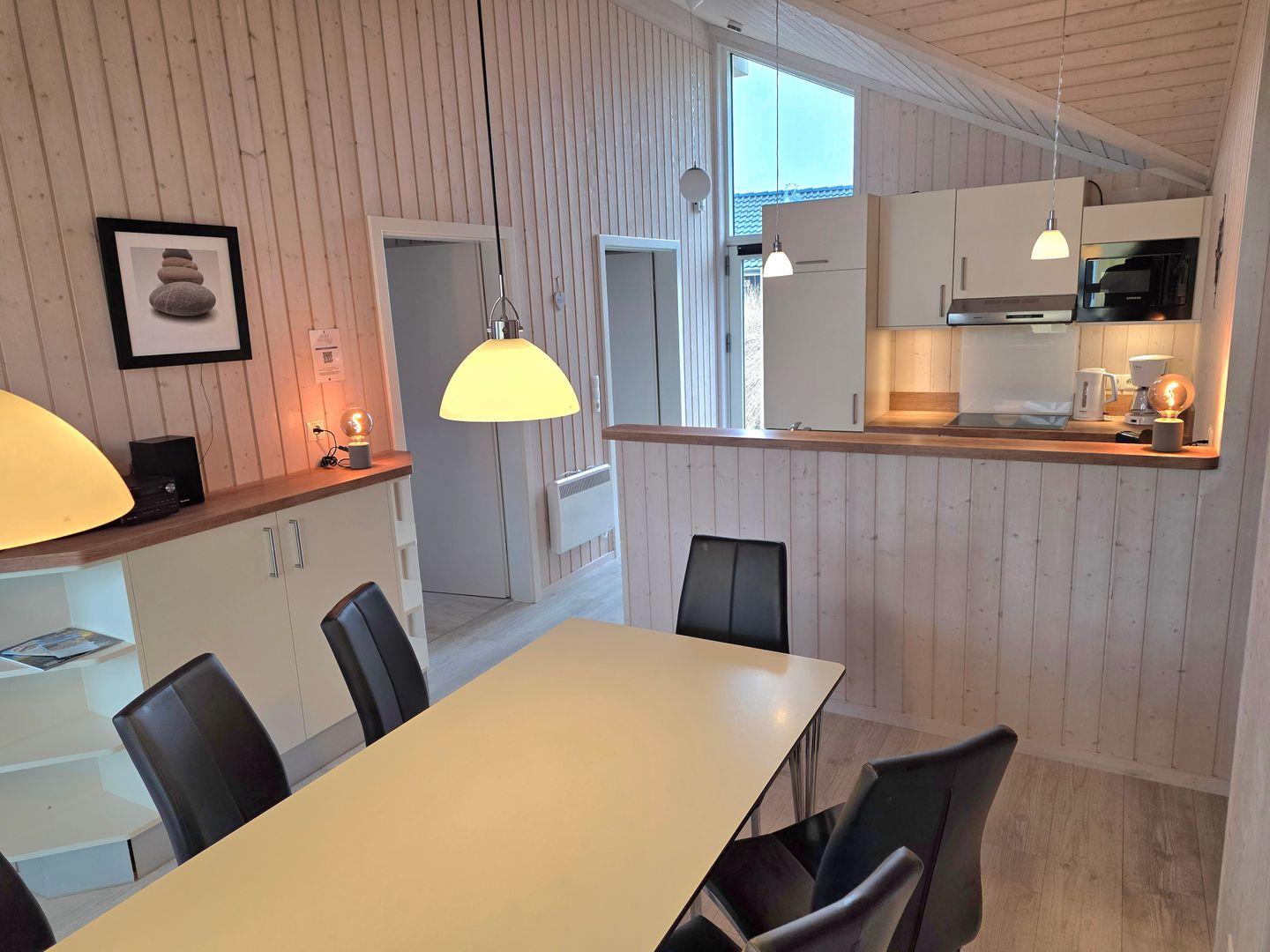 Eine sehr gemütliche Sofaecke lädt zum Chillen ein und am großen Esstisch lassen sich die gemeinsamen Mahlzeiten und ausgelassene Spieleabende genießen. Im Wohnbereich befinden sich der Kaminofen, das Sat-TV und eine Stereoanlage mit Radio.