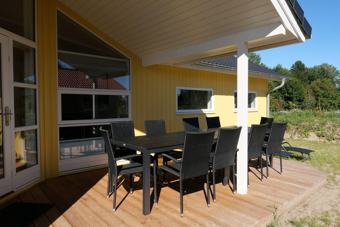 Vom Wohnbereich aus haben Sie Zugang zur teils überdachten, mit großem Gartentisch und Stühlen möblierten Terrasse, auf der Sie die langen Sommerabende genießen können. 2 Sonnenliegen stehen Ihnen ebenfalls zur freien Verfügung.