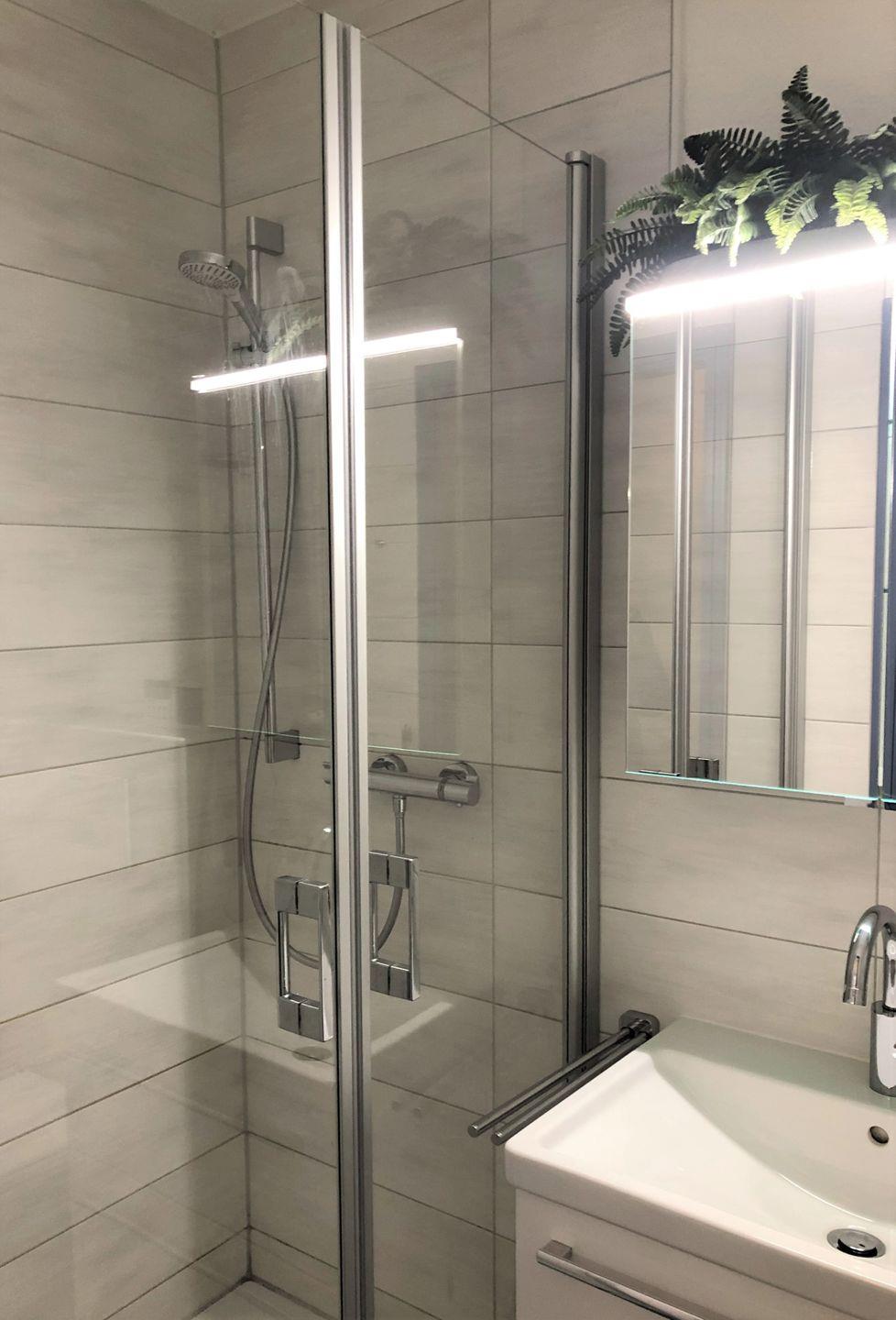 Das moderne Bad verfügt über eine extragroße Dusche mit Glaswänden, klappbarem Duschsitz und niedrigem Einstieg.