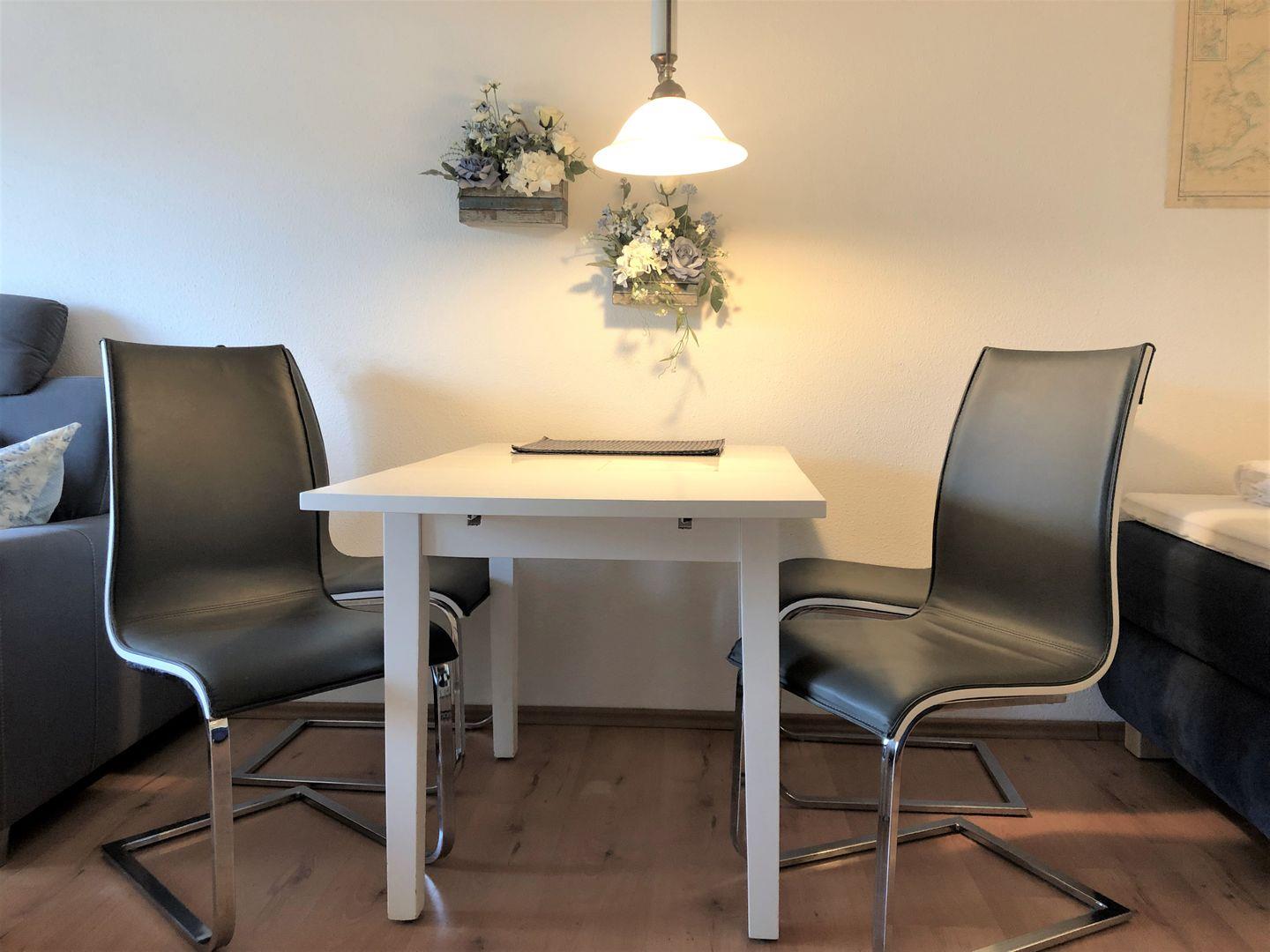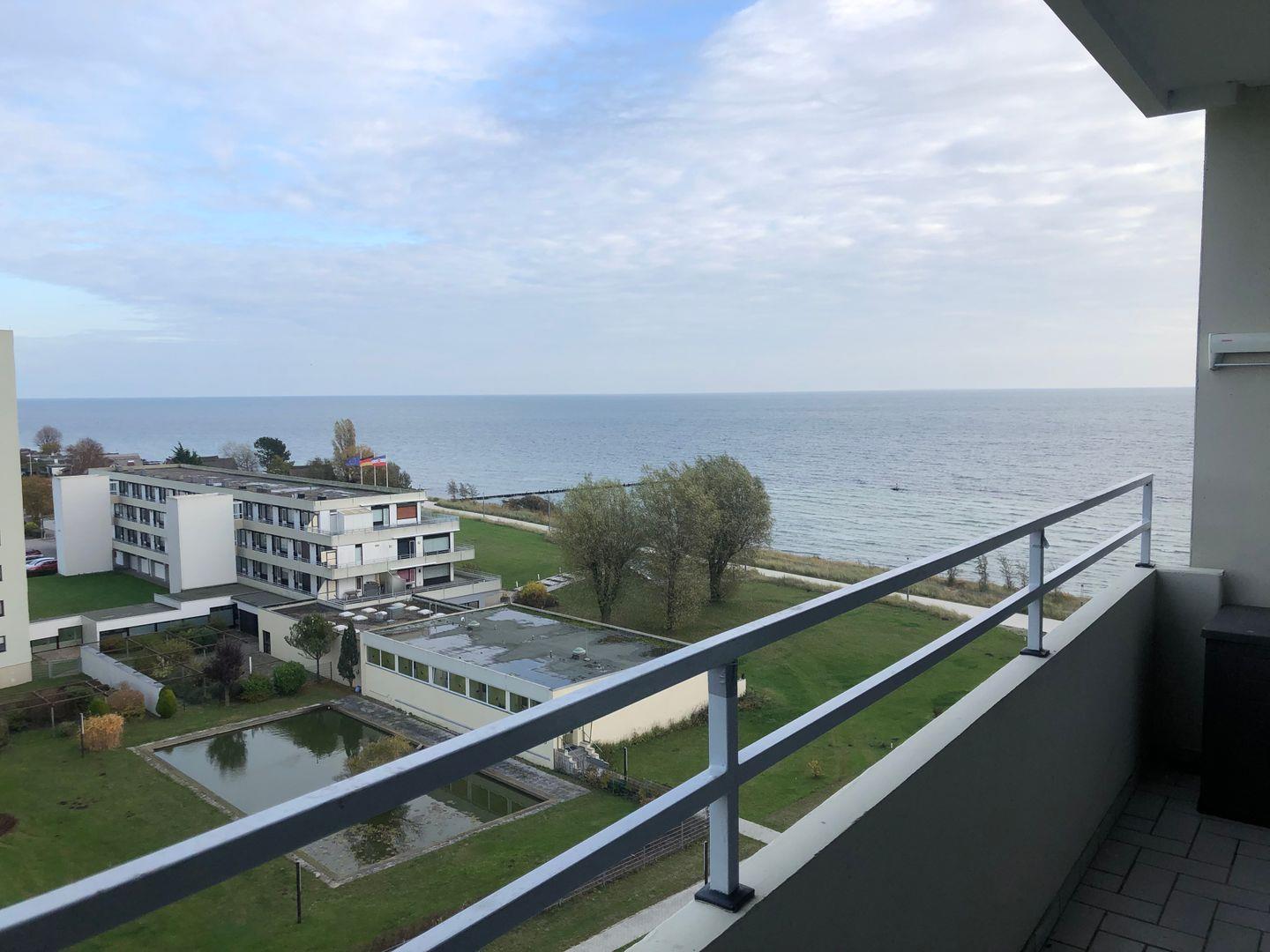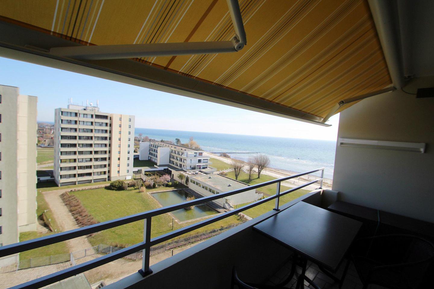 dem liebevoll renovierten Zwei-Zimmer-Appartement für max. vier Gäste mit Blick aus dem 8. Stock Richtung Insel Fehmarn. Auf dem Balkon können Sie bei Morgensonne Ihr Frühstück bei seitlichem Meerblick genießen. Gegen zu viel Sonne hilft eine große, freundlich gelbe Markise.