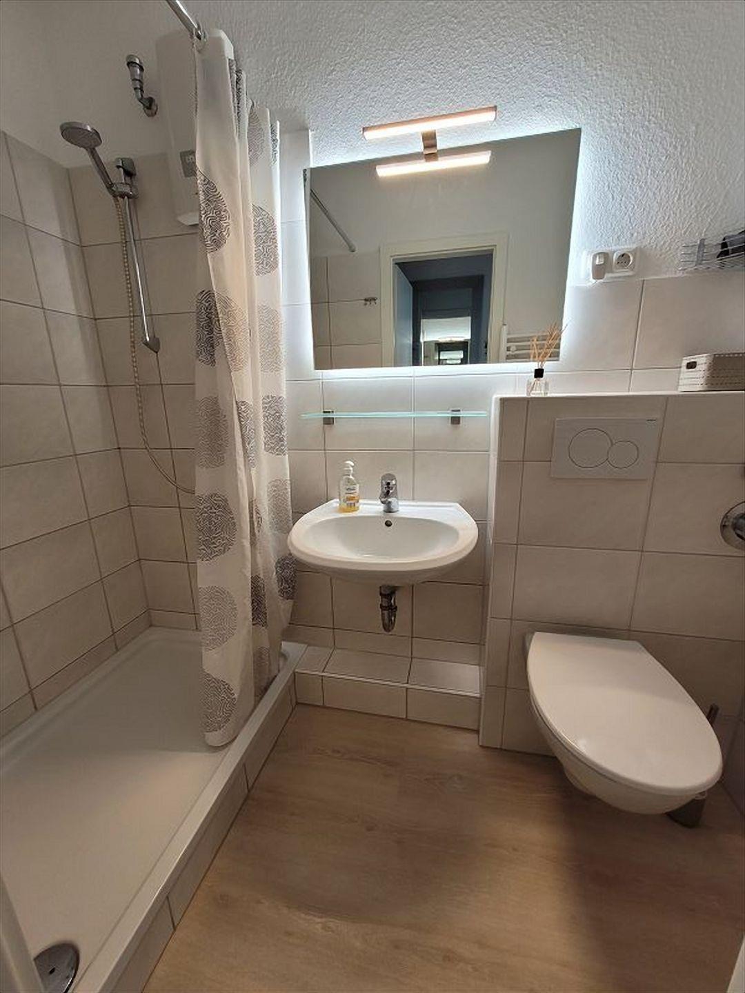 Im sanierten, innenliegenden Duschbad wurde ein Handtuchheizkörper, eine extrabreite Duschwanne mit flachem Einstieg und ein beleuchteter Spiegel verbaut.