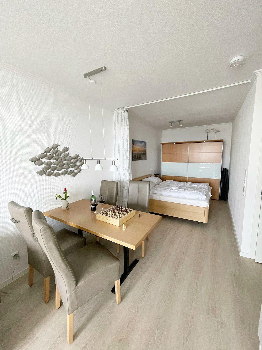 Die Wohnung ist für 3 Personen umfassend ausgestattet und wurde mit Design-Vinyl hochwertig ausgelegt.