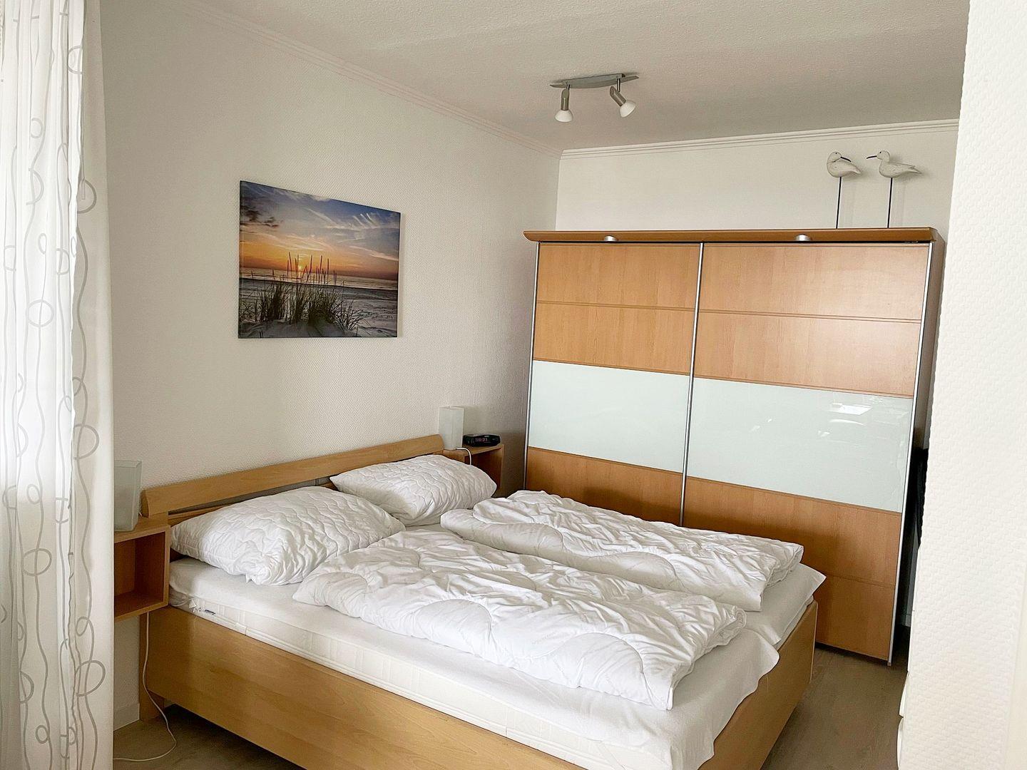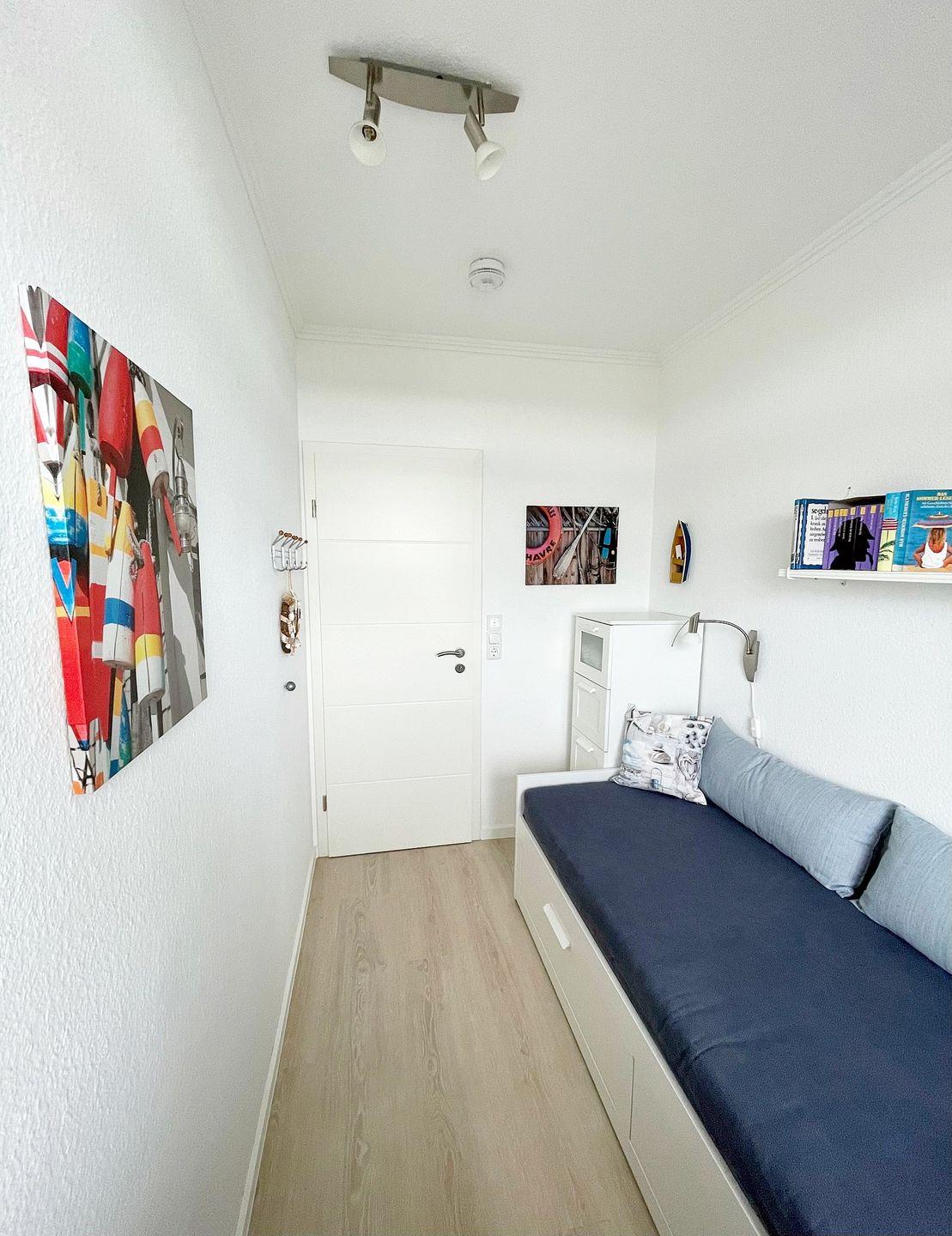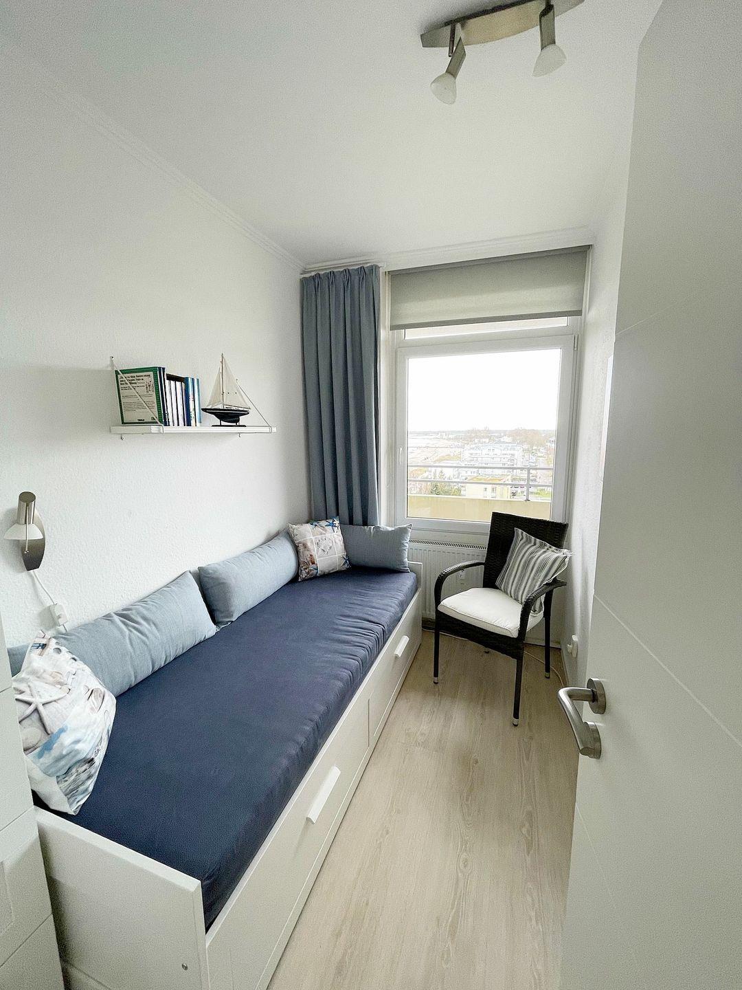 Das zusätzliche, freundlich Schlafzimmer hält ein Einzelbett (80*200 cm) sowie eine Kommode bereit. Auch von hier begeistert die herrliche Aussicht auf Strand und Ostsee.
