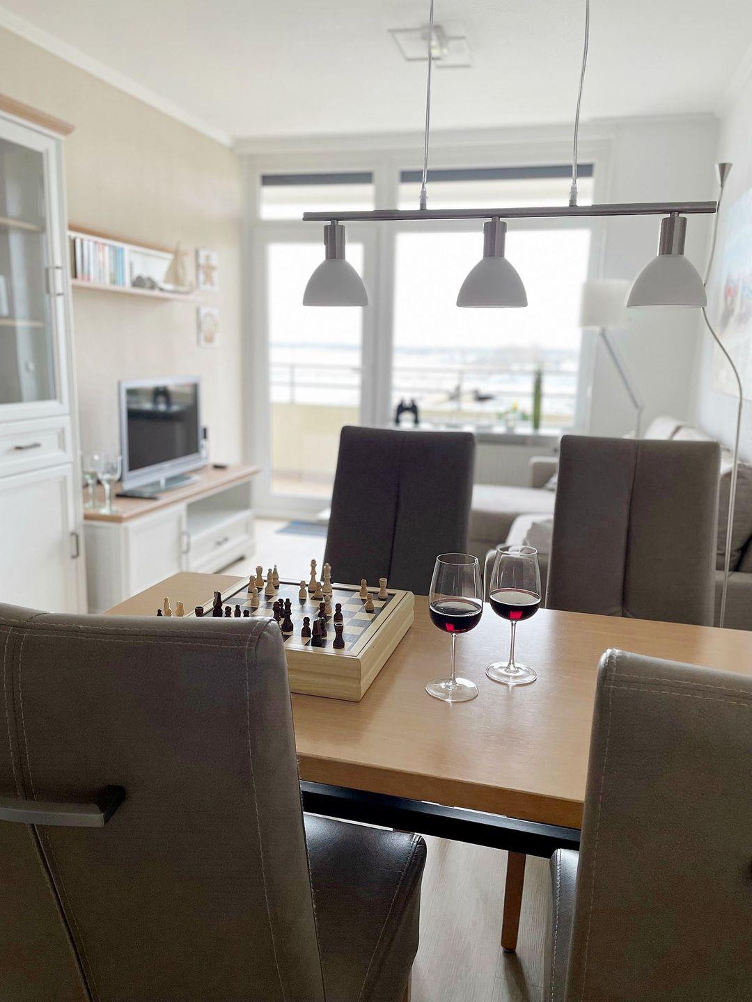 Die helle Einbauküche hält ein Glaskeramikherd mit 4 Kochstellen, Backofen, Kühlschrank und Geschirrspüler für Ihre Selbstversorgung im Urlaub bereit. Ob gemeinsame Mahlzeiten, Spieleabende oder die Planung der nächsten Ausflüge: Am Esstisch mit den gemütlichen Polsterstühlen, auf der großen Couch oder auf den Balkonmöbeln mit dicken Polstern finden Sie viele gemütliche Plätze.