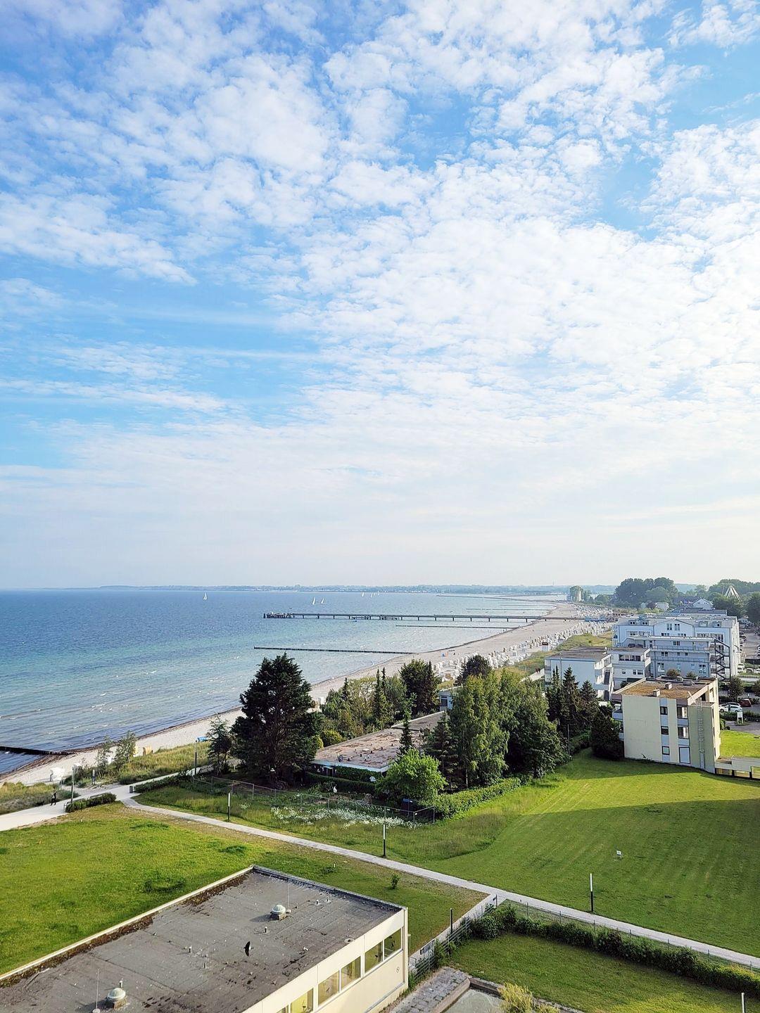 Dieses sehr moderne 2-Zimmer-Appartement befindet sich im 9. Stock des Hauses und wird Sie mit ihrem traumhaften Ausblick begeistern: Vom hochwertig und gemütlich ausgestatteten Balkon genießen Sie die Aussicht über den gesamten Südstrand mit seiner neuen Promenade auf das mal glitzernde, mal stürmische und mal spiegelglatte Meer!